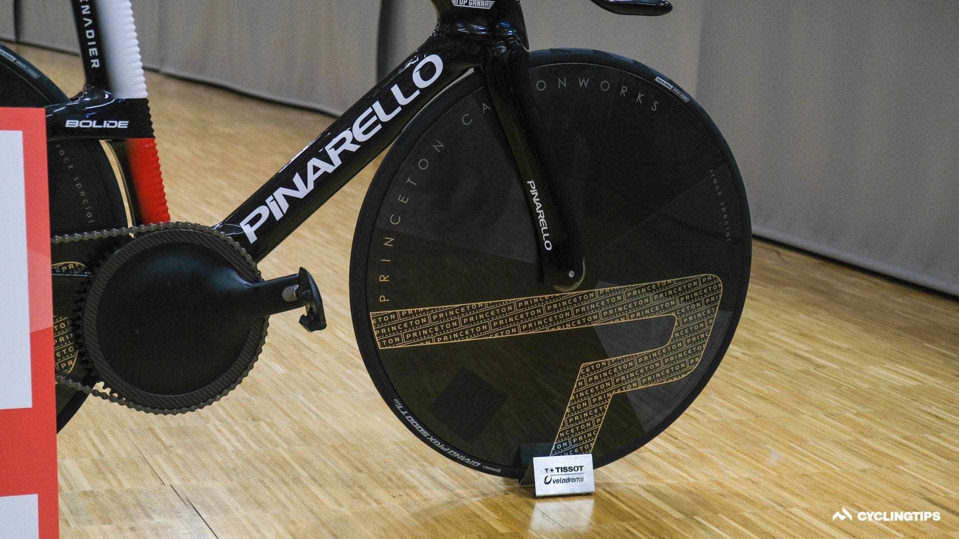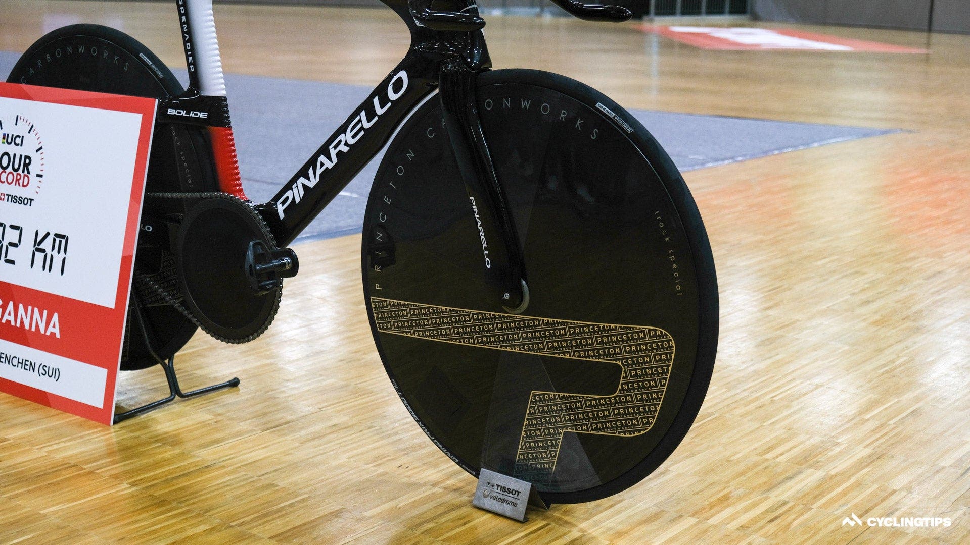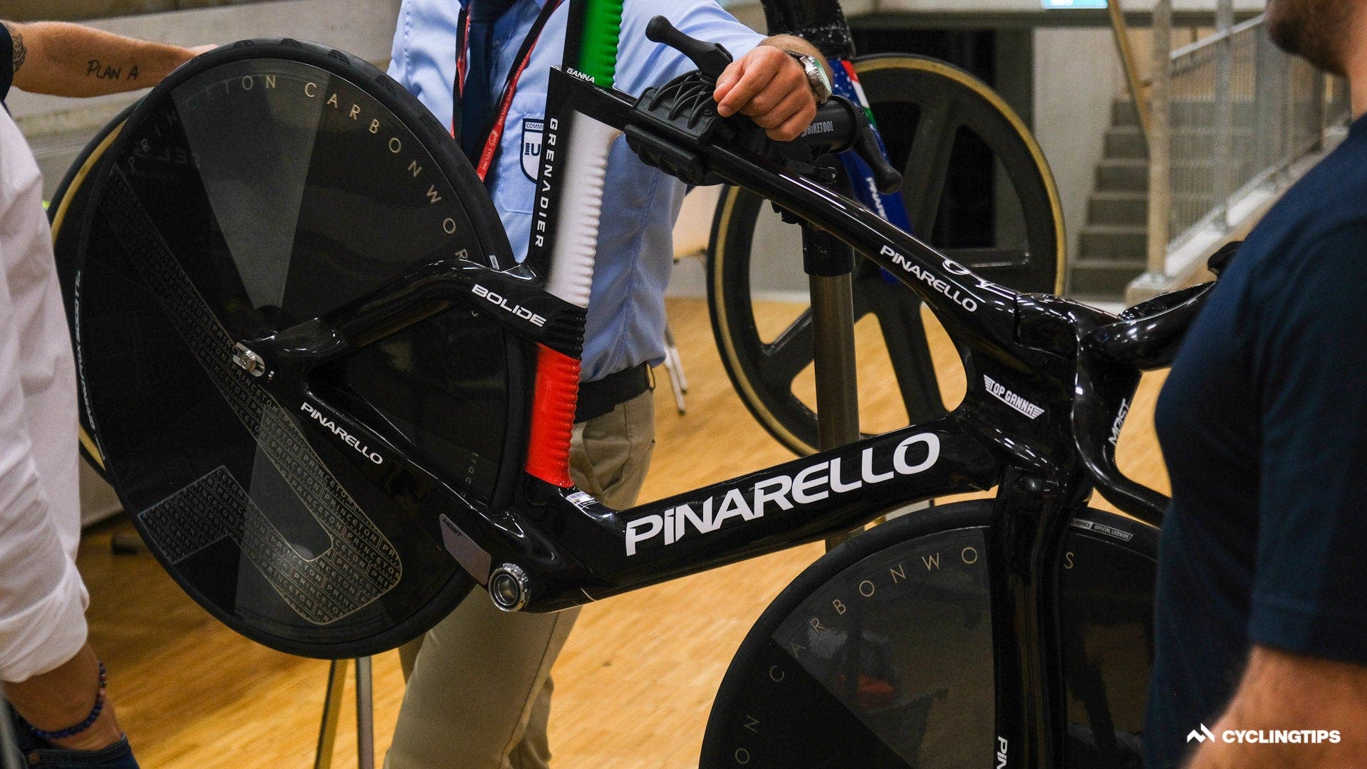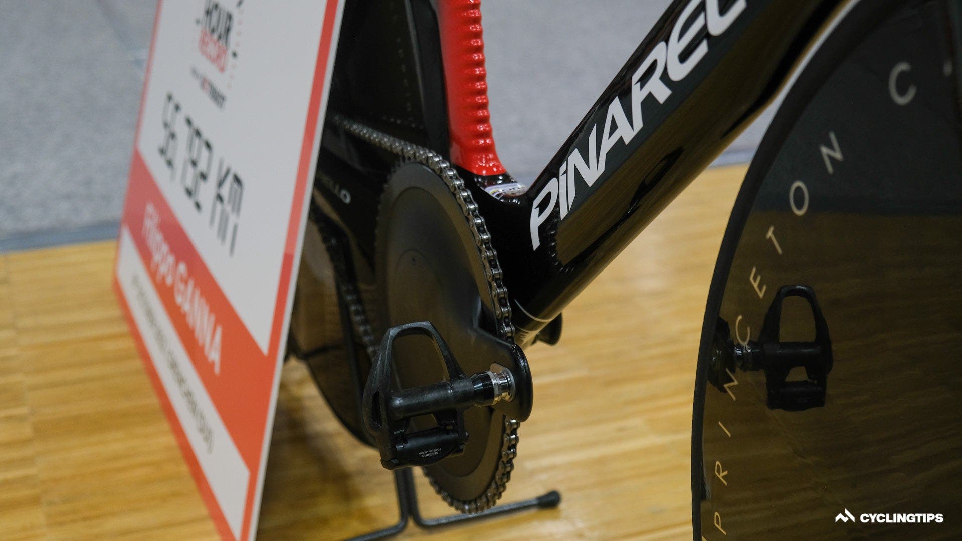 Done and dusted. After two new world records in the space of two months, 56.792 km will surely stand for quite a while.Top Ganna by name, the top-est rider of all time by nature.The Bolide moniker has donned several innovative Pinarello aero frames over the past decade, but this latest iteration, a 3D printed, humpback whale inspired, ultra-narrow track bike must surely be the most innovative of all?The humpback whale tubercle-mimicking ridges on the seat tube and down tube are said to help the airflow coming off the rider’s legs to attach to the aero profiled tubes and significantly reduce the drag of the overall rider and bike system.The relatively deep ridges generate vortices in the troughs between the bumps on the seat tube, helping reduce airflow separation and hence the drag on the frame.The new bike is also incredibly narrow. Pinarello focused on reduced frontal area as one way of further reducing the aero drag on the bike.It’s remarkable just how narrow the new front end is…Could barely slide a fiver in between that fork and disc wheel.As narrow as the gap between fork and wheel are…The 2mm between hub shell and fork leg is quite incredible. Furthermore, it’s not just a small gap between the fork and hubs, the hubs themselves are significantly narrower than standard hubs at just 69 mm (down from 100 mm) wide at the front and 89 mm (down from 120 mm) at the rear. Presumably the hubs were oiled rather than greased, the same setup Bigham used for his successful attempt in August.It’s the same out back, the Bolide is so narrow it could almost slide between a wall and a picture frame.Such a narrow bike needed narrower wheels, and Princeton Carbon Works created these bike-specific wheels for the Hour Record project. In fact, the wheels and hubs were designed for optimal efficiency in terms of both shape and width with the bike dropouts then made to match.It’s not just about going fast, Ganna wanted to look good too. These Top Ganna chrome decals certainly tick that box.Every aspect of frame, fork and wheel integration was considered. The head tube nose cone flows onto the fork head, which in turn flows onto the down tube, all in a way that complies with the UCI regulations. While the front wheel hugs the down tube cutout as close as possible.The tyres are also narrow. 23 mm Continental GP 5000 TTs got the nod, and bulge out on the wide disc to almost seamlessly integrate with the disc wheel. Ganna was riding the same clincher setup as used by Bigham back in August, with pressures said to be “not quite the 15 bar you might put in a track tub, but significantly higher than you would run on the road.”Narrow and deep, that’s the magic recipe for an aero profile. Head on, the frame and fork are extremely narrow, viewed from the side the tubes are very deep to improve the airflow over the bike and reduce drag.Ganna’s bars are also custom made and 3D printed specifically for the new world record holder. The base bar is narrow and profiled, but it’s the extensions that are perhaps most interesting. The kinked risers are actually an aerodynamic intervention, designed to control the airflow onto Ganna’s legs and reduce the overall drag on the bike and rider system as a whole.These channels in the elbow-like risers direct the airflow as it comes off the riser.The exact shape of the extensions is designed to perfectly match Ganna’s forearms, maximise aerodynamic efficiency while still complying with the UCI regulations. The “elbow rests” are relatively high on the extension, presumably to bring the rests in line with the UCI’s 10 cm maximum height difference between the elbow support point and the highest point of the extension. As such, Ganna actually rests his forearms on the extensions rather than his elbows, it’s a position commonly adopted by those pushing right to the limits of the UCI regulations.The grips themselves are different from the mesh-like grips Ganna has used on the road this year.Sticking with big and narrow, Ganna used a Wattshop Cratus Aero modular crankset with a huge 65-tooth front chainring.The crank arms are again phenomenally narrow as is the Q-Factor at just 134 mm. The crank lengths are adjustable, and while we don’t know which length Ganna opted for, the cranks offer anything from 160 mm right the way up to 175 mm, with the usual 2.5 mm jumps in lengths.But again, what is narrow head on, is relatively huge when viewed from the side. Aero is everything and the Wattshop Cratus cranks are effectively one large aero profile with a great big chainring stuck to it. The chainrings themselves are low friction additive infused 1/8” track chainring. While the stepped edge chainring design ensures the outer plates of the chain sit flush with the chainring to reduce air-flow separation.Ganna didn’t just have one bike, though. UCI regulations state all Hour Record attempts must have two approved bikes on site. The bike Ineos Grenadiers presented for photographs was actually Ganna’s spare bike, we did of course grab some photos of the actual record bike also.The race bike was practically identical to spare bike, bar the inclusion of power meter pedals and a Garmin mounted under the saddle.Oh, and a name badge seat post height marker.The race bike was taken for a UCI check immediately post ride. This is the scene just moments after the finish with the cranks removed and a UCI commissaire on site presumably for some form of motor check. The motor (Ganna himself) had already dismounted the bike.Ganna resisted the temptation of Speedplay Aero pedals used so often for track record attempts, and instead opted for Favero’s Assioma Shi power meter pedals. The Assioma Shi do add a considerable 13 mm to the system Q-Factor, but I guess when the bottom bracket of your 3D-printed track bike and the Q-Factor of your matching aero cranks is already so far reduced, the extra 13 mm might just bring the power pedals back up to a normal width. No doubt D