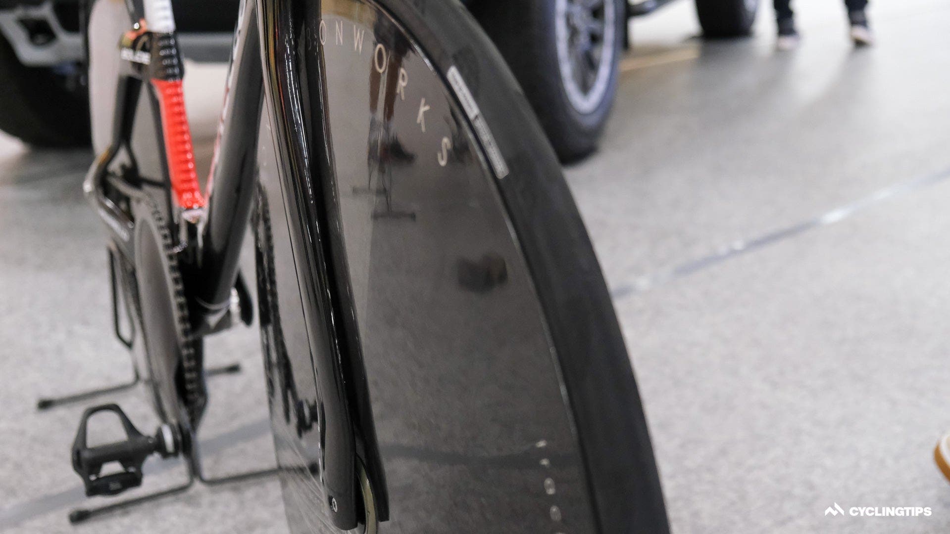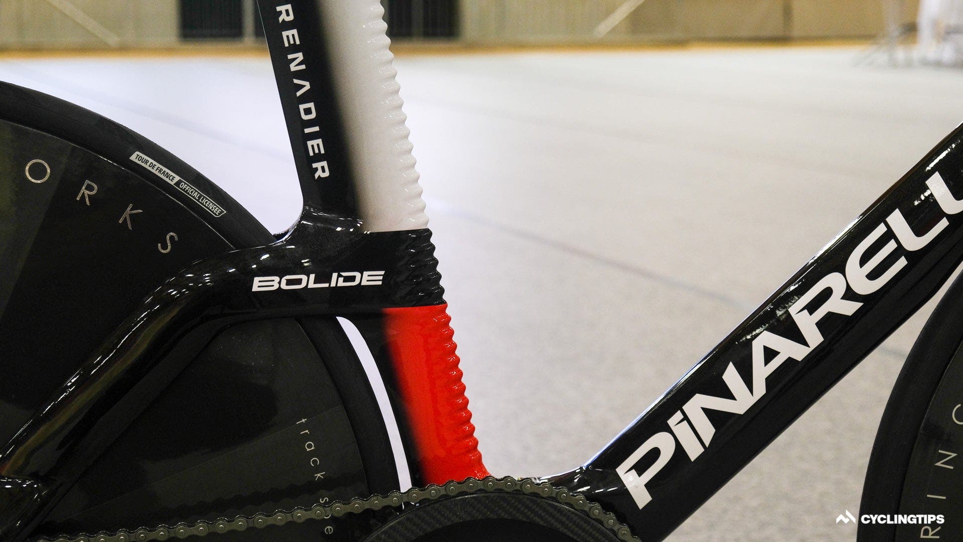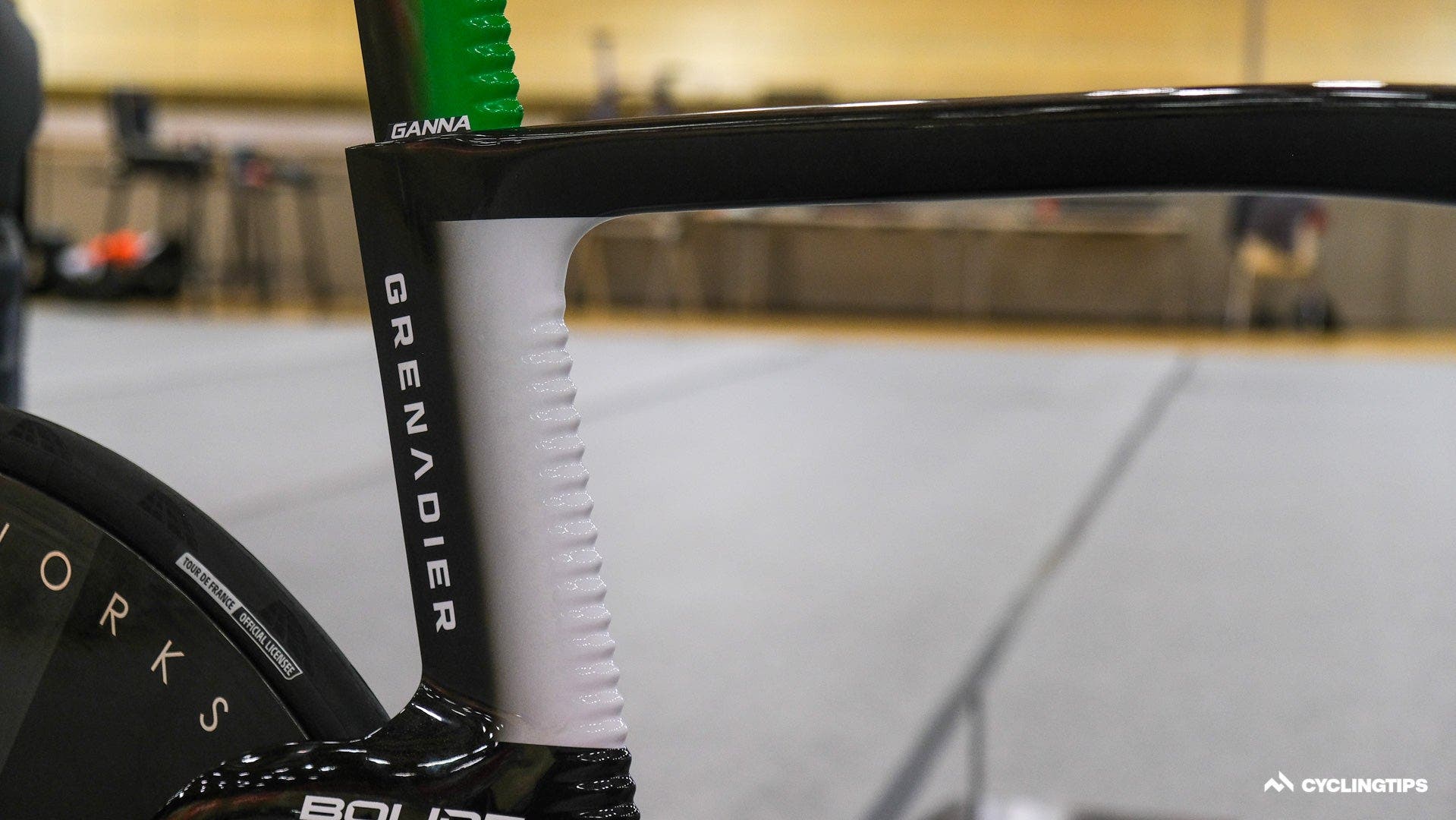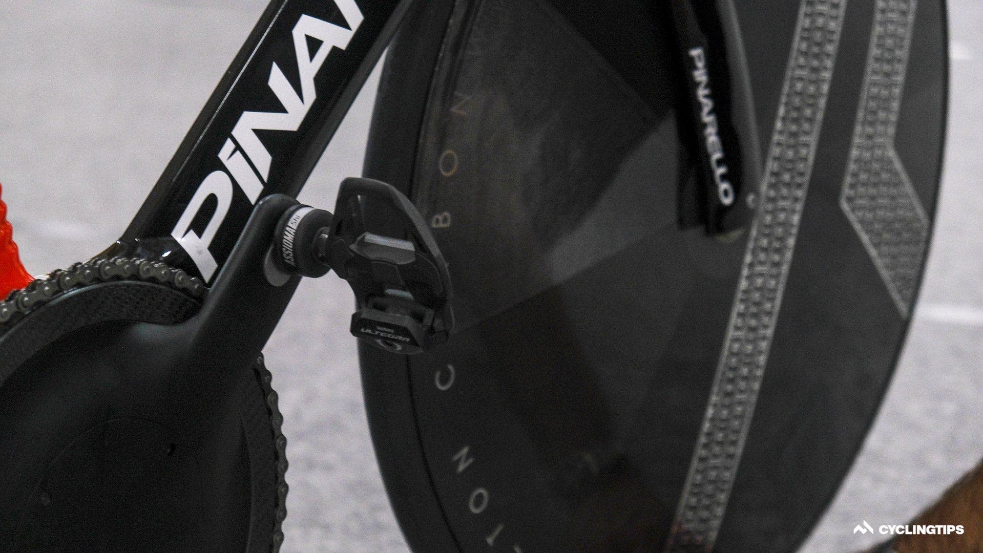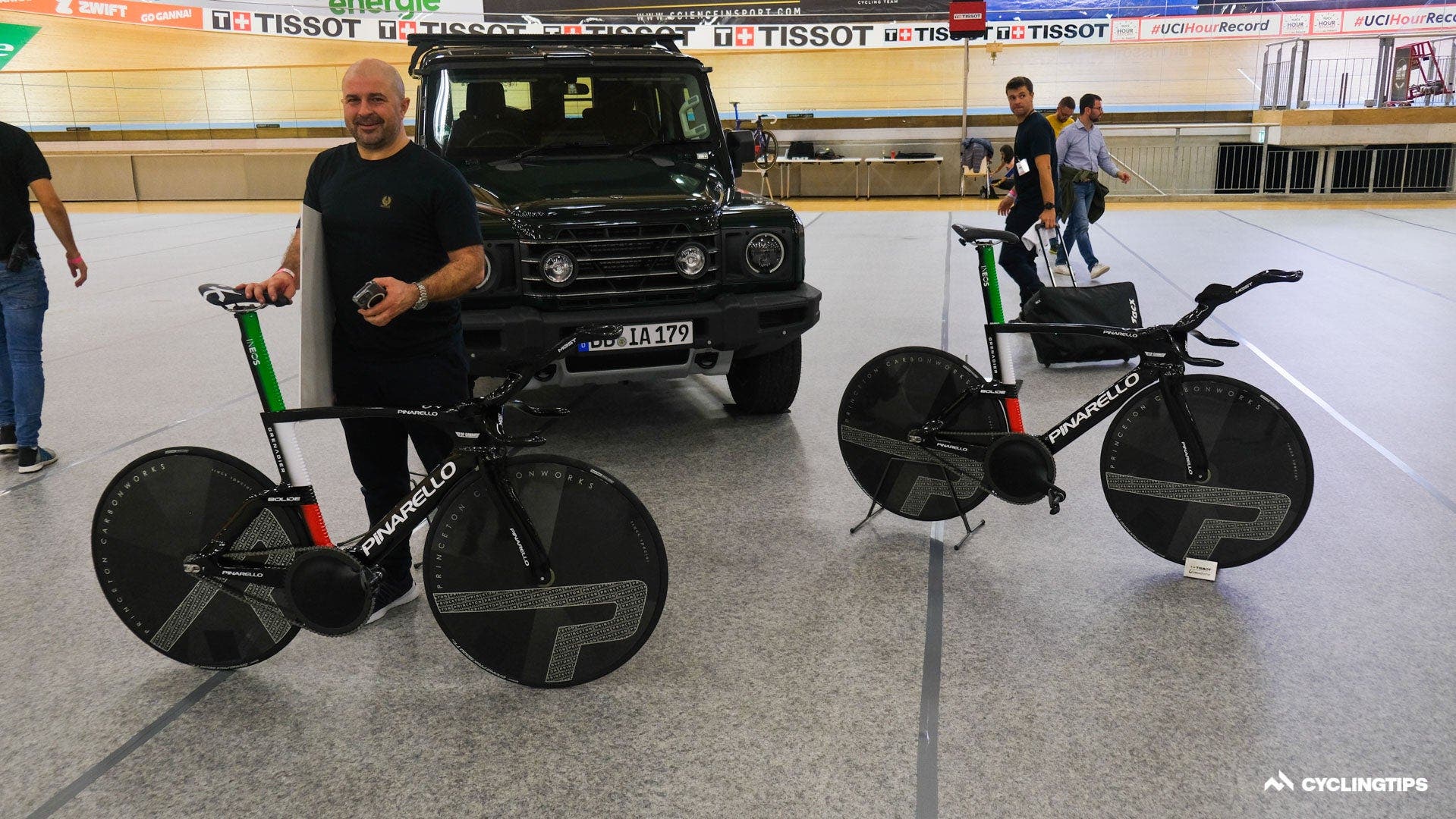 Done and dusted. After two new world records in the space of two months, 56.792 km will surely stand for quite a while.Top Ganna by name, the top-est rider of all time by nature.The Bolide moniker has donned several innovative Pinarello aero frames over the past decade, but this latest iteration, a 3D printed, humpback whale inspired, ultra-narrow track bike must surely be the most innovative of all?The humpback whale tubercle-mimicking ridges on the seat tube and down tube are said to help the airflow coming off the rider’s legs to attach to the aero profiled tubes and significantly reduce the drag of the overall rider and bike system.The relatively deep ridges generate vortices in the troughs between the bumps on the seat tube, helping reduce airflow separation and hence the drag on the frame.The new bike is also incredibly narrow. Pinarello focused on reduced frontal area as one way of further reducing the aero drag on the bike.It’s remarkable just how narrow the new front end is…Could barely slide a fiver in between that fork and disc wheel.As narrow as the gap between fork and wheel are…The 2mm between hub shell and fork leg is quite incredible. Furthermore, it’s not just a small gap between the fork and hubs, the hubs themselves are significantly narrower than standard hubs at just 69 mm (down from 100 mm) wide at the front and 89 mm (down from 120 mm) at the rear. Presumably the hubs were oiled rather than greased, the same setup Bigham used for his successful attempt in August.It’s the same out back, the Bolide is so narrow it could almost slide between a wall and a picture frame.Such a narrow bike needed narrower wheels, and Princeton Carbon Works created these bike-specific wheels for the Hour Record project. In fact, the wheels and hubs were designed for optimal efficiency in terms of both shape and width with the bike dropouts then made to match.It’s not just about going fast, Ganna wanted to look good too. These Top Ganna chrome decals certainly tick that box.Every aspect of frame, fork and wheel integration was considered. The head tube nose cone flows onto the fork head, which in turn flows onto the down tube, all in a way that complies with the UCI regulations. While the front wheel hugs the down tube cutout as close as possible.The tyres are also narrow. 23 mm Continental GP 5000 TTs got the nod, and bulge out on the wide disc to almost seamlessly integrate with the disc wheel. Ganna was riding the same clincher setup as used by Bigham back in August, with pressures said to be “not quite the 15 bar you might put in a track tub, but significantly higher than you would run on the road.”Narrow and deep, that’s the magic recipe for an aero profile. Head on, the frame and fork are extremely narrow, viewed from the side the tubes are very deep to improve the airflow over the bike and reduce drag.Ganna’s bars are also custom made and 3D printed specifically for the new world record holder. The base bar is narrow and profiled, but it’s the extensions that are perhaps most interesting. The kinked risers are actually an aerodynamic intervention, designed to control the airflow onto Ganna’s legs and reduce the overall drag on the bike and rider system as a whole.These channels in the elbow-like risers direct the airflow as it comes off the riser.The exact shape of the extensions is designed to perfectly match Ganna’s forearms, maximise aerodynamic efficiency while still complying with the UCI regulations. The “elbow rests” are relatively high on the extension, presumably to bring the rests in line with the UCI’s 10 cm maximum height difference between the elbow support point and the highest point of the extension. As such, Ganna actually rests his forearms on the extensions rather than his elbows, it’s a position commonly adopted by those pushing right to the limits of the UCI regulations.The grips themselves are different from the mesh-like grips Ganna has used on the road this year.Sticking with big and narrow, Ganna used a Wattshop Cratus Aero modular crankset with a huge 65-tooth front chainring.The crank arms are again phenomenally narrow as is the Q-Factor at just 134 mm. The crank lengths are adjustable, and while we don’t know which length Ganna opted for, the cranks offer anything from 160 mm right the way up to 175 mm, with the usual 2.5 mm jumps in lengths.But again, what is narrow head on, is relatively huge when viewed from the side. Aero is everything and the Wattshop Cratus cranks are effectively one large aero profile with a great big chainring stuck to it. The chainrings themselves are low friction additive infused 1/8” track chainring. While the stepped edge chainring design ensures the outer plates of the chain sit flush with the chainring to reduce air-flow separation.Ganna didn’t just have one bike, though. UCI regulations state all Hour Record attempts must have two approved bikes on site. The bike Ineos Grenadiers presented for photographs was actually Ganna’s spare bike, we did of course grab some photos of the actual record bike also.The race bike was practically identical to spare bike, bar the inclusion of power meter pedals and a Garmin mounted under the saddle.Oh, and a name badge seat post height marker.The race bike was taken for a UCI check immediately post ride. This is the scene just moments after the finish with the cranks removed and a UCI commissaire on site presumably for some form of motor check. The motor (Ganna himself) had already dismounted the bike.Ganna resisted the temptation of Speedplay Aero pedals used so often for track record attempts, and instead opted for Favero’s Assioma Shi power meter pedals. The Assioma Shi do add a considerable 13 mm to the system Q-Factor, but I guess when the bottom bracket of your 3D-printed track bike and the Q-Factor of your matching aero cranks is already so far reduced, the extra 13 mm might just bring the power pedals back up to a normal width. No doubt D