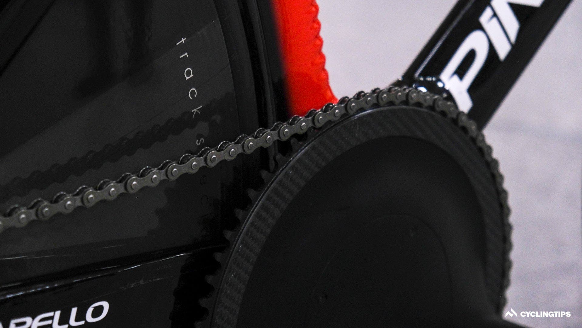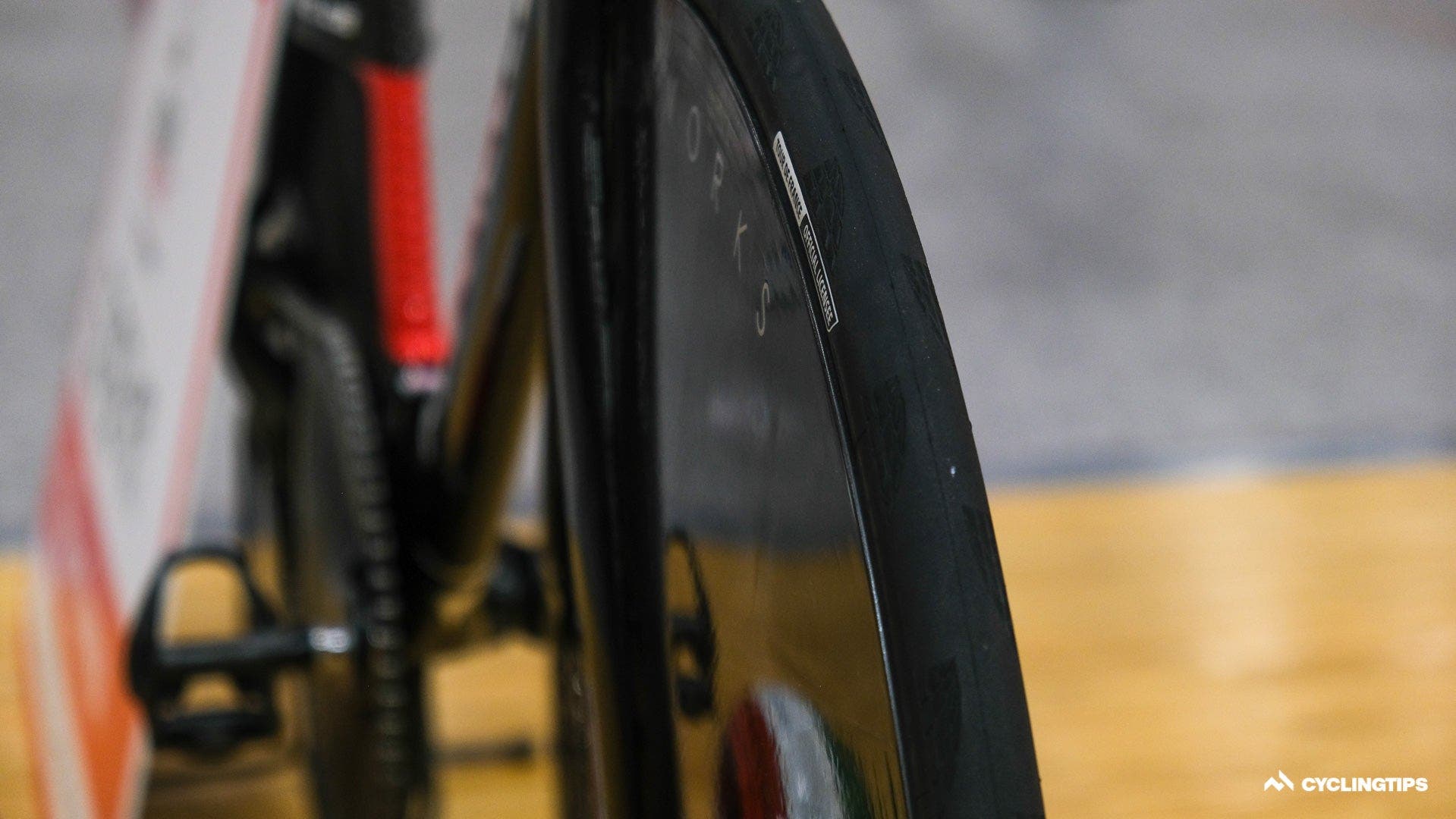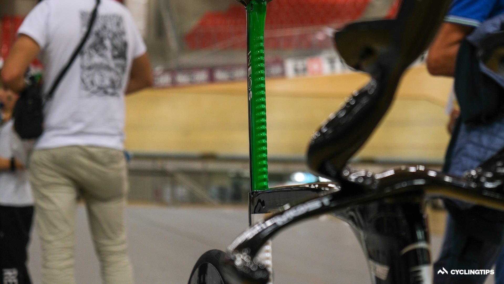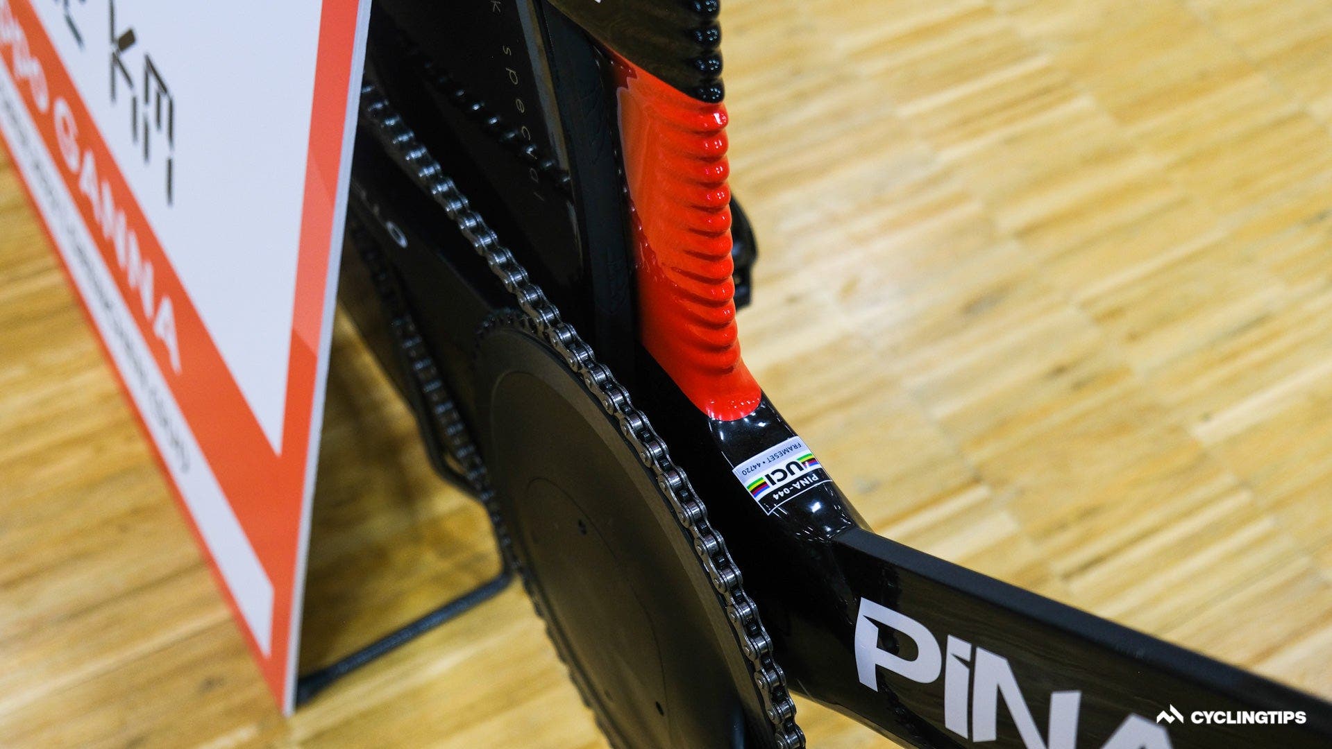 Done and dusted. After two new world records in the space of two months, 56.792 km will surely stand for quite a while.Top Ganna by name, the top-est rider of all time by nature.The Bolide moniker has donned several innovative Pinarello aero frames over the past decade, but this latest iteration, a 3D printed, humpback whale inspired, ultra-narrow track bike must surely be the most innovative of all?The humpback whale tubercle-mimicking ridges on the seat tube and down tube are said to help the airflow coming off the rider’s legs to attach to the aero profiled tubes and significantly reduce the drag of the overall rider and bike system.The relatively deep ridges generate vortices in the troughs between the bumps on the seat tube, helping reduce airflow separation and hence the drag on the frame.The new bike is also incredibly narrow. Pinarello focused on reduced frontal area as one way of further reducing the aero drag on the bike.It’s remarkable just how narrow the new front end is…Could barely slide a fiver in between that fork and disc wheel.As narrow as the gap between fork and wheel are…The 2mm between hub shell and fork leg is quite incredible. Furthermore, it’s not just a small gap between the fork and hubs, the hubs themselves are significantly narrower than standard hubs at just 69 mm (down from 100 mm) wide at the front and 89 mm (down from 120 mm) at the rear. Presumably the hubs were oiled rather than greased, the same setup Bigham used for his successful attempt in August.It’s the same out back, the Bolide is so narrow it could almost slide between a wall and a picture frame.Such a narrow bike needed narrower wheels, and Princeton Carbon Works created these bike-specific wheels for the Hour Record project. In fact, the wheels and hubs were designed for optimal efficiency in terms of both shape and width with the bike dropouts then made to match.It’s not just about going fast, Ganna wanted to look good too. These Top Ganna chrome decals certainly tick that box.Every aspect of frame, fork and wheel integration was considered. The head tube nose cone flows onto the fork head, which in turn flows onto the down tube, all in a way that complies with the UCI regulations. While the front wheel hugs the down tube cutout as close as possible.The tyres are also narrow. 23 mm Continental GP 5000 TTs got the nod, and bulge out on the wide disc to almost seamlessly integrate with the disc wheel. Ganna was riding the same clincher setup as used by Bigham back in August, with pressures said to be “not quite the 15 bar you might put in a track tub, but significantly higher than you would run on the road.”Narrow and deep, that’s the magic recipe for an aero profile. Head on, the frame and fork are extremely narrow, viewed from the side the tubes are very deep to improve the airflow over the bike and reduce drag.Ganna’s bars are also custom made and 3D printed specifically for the new world record holder. The base bar is narrow and profiled, but it’s the extensions that are perhaps most interesting. The kinked risers are actually an aerodynamic intervention, designed to control the airflow onto Ganna’s legs and reduce the overall drag on the bike and rider system as a whole.These channels in the elbow-like risers direct the airflow as it comes off the riser.The exact shape of the extensions is designed to perfectly match Ganna’s forearms, maximise aerodynamic efficiency while still complying with the UCI regulations. The “elbow rests” are relatively high on the extension, presumably to bring the rests in line with the UCI’s 10 cm maximum height difference between the elbow support point and the highest point of the extension. As such, Ganna actually rests his forearms on the extensions rather than his elbows, it’s a position commonly adopted by those pushing right to the limits of the UCI regulations.The grips themselves are different from the mesh-like grips Ganna has used on the road this year.Sticking with big and narrow, Ganna used a Wattshop Cratus Aero modular crankset with a huge 65-tooth front chainring.The crank arms are again phenomenally narrow as is the Q-Factor at just 134 mm. The crank lengths are adjustable, and while we don’t know which length Ganna opted for, the cranks offer anything from 160 mm right the way up to 175 mm, with the usual 2.5 mm jumps in lengths.But again, what is narrow head on, is relatively huge when viewed from the side. Aero is everything and the Wattshop Cratus cranks are effectively one large aero profile with a great big chainring stuck to it. The chainrings themselves are low friction additive infused 1/8” track chainring. While the stepped edge chainring design ensures the outer plates of the chain sit flush with the chainring to reduce air-flow separation.Ganna didn’t just have one bike, though. UCI regulations state all Hour Record attempts must have two approved bikes on site. The bike Ineos Grenadiers presented for photographs was actually Ganna’s spare bike, we did of course grab some photos of the actual record bike also.The race bike was practically identical to spare bike, bar the inclusion of power meter pedals and a Garmin mounted under the saddle.Oh, and a name badge seat post height marker.The race bike was taken for a UCI check immediately post ride. This is the scene just moments after the finish with the cranks removed and a UCI commissaire on site presumably for some form of motor check. The motor (Ganna himself) had already dismounted the bike.Ganna resisted the temptation of Speedplay Aero pedals used so often for track record attempts, and instead opted for Favero’s Assioma Shi power meter pedals. The Assioma Shi do add a considerable 13 mm to the system Q-Factor, but I guess when the bottom bracket of your 3D-printed track bike and the Q-Factor of your matching aero cranks is already so far reduced, the extra 13 mm might just bring the power pedals back up to a normal width. No doubt D