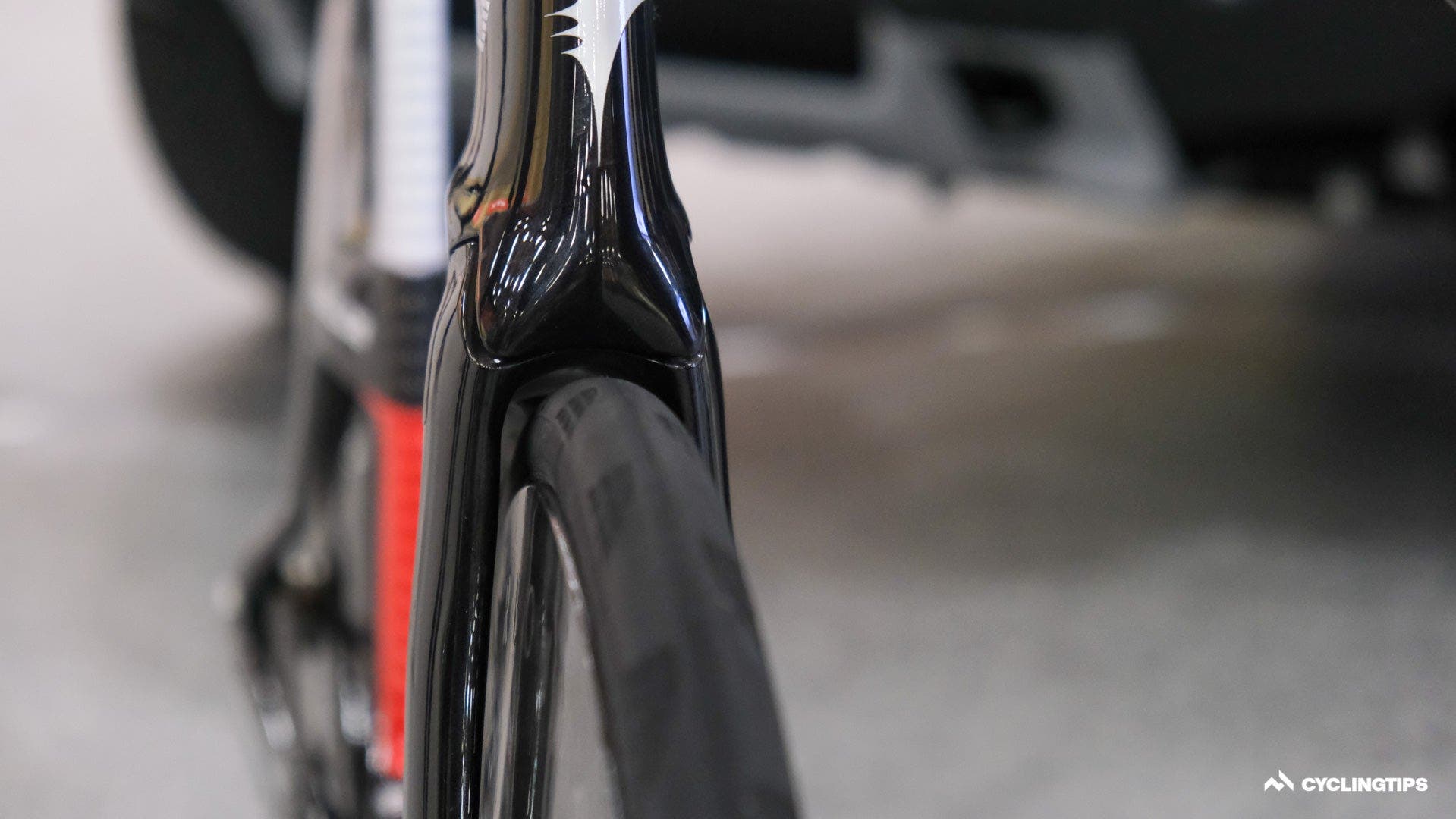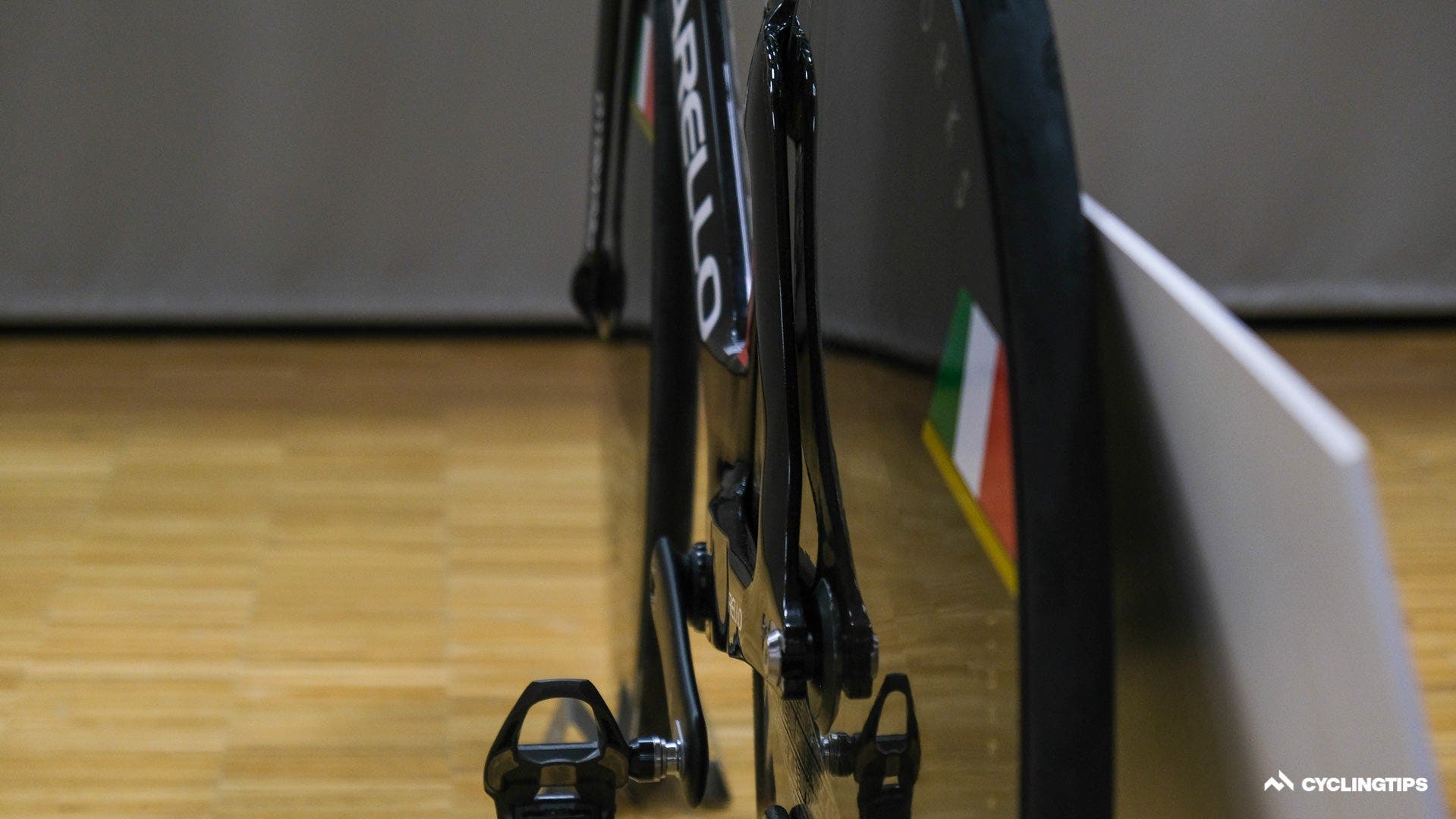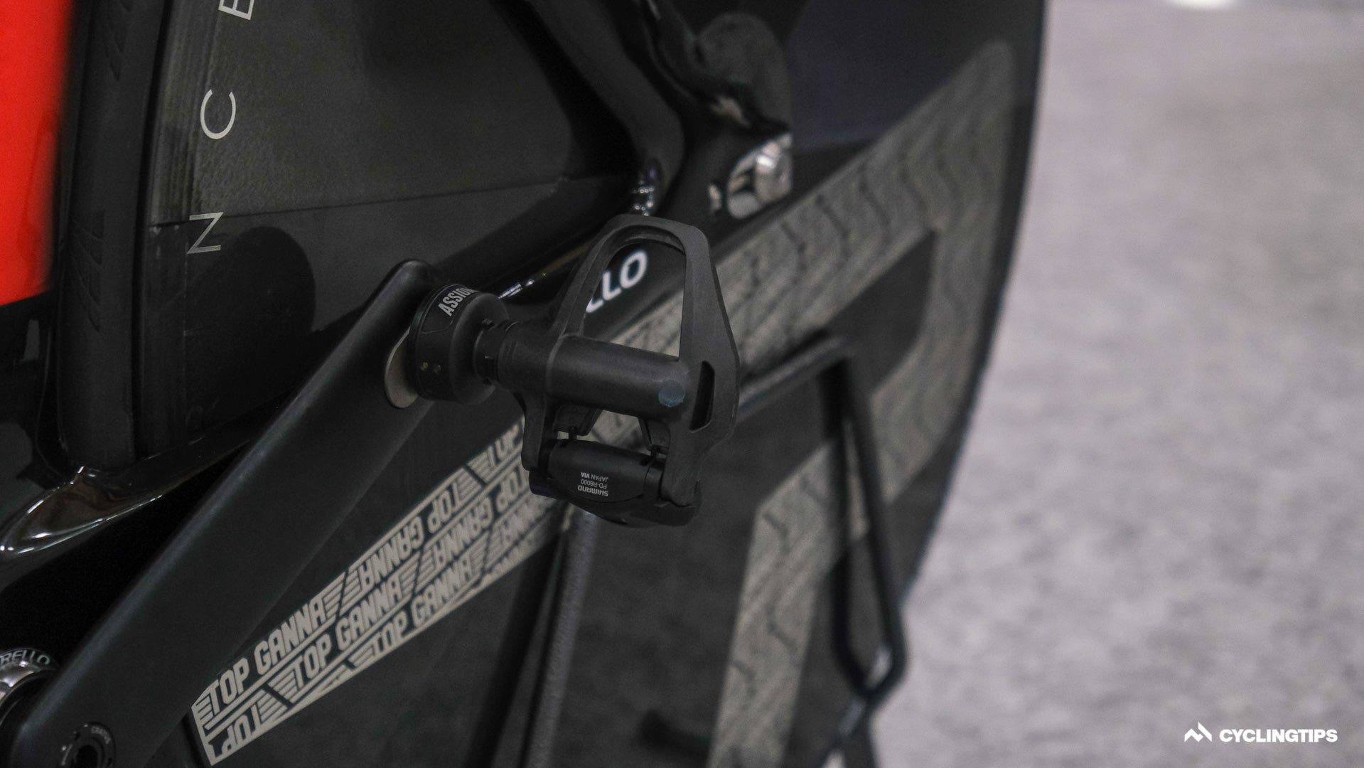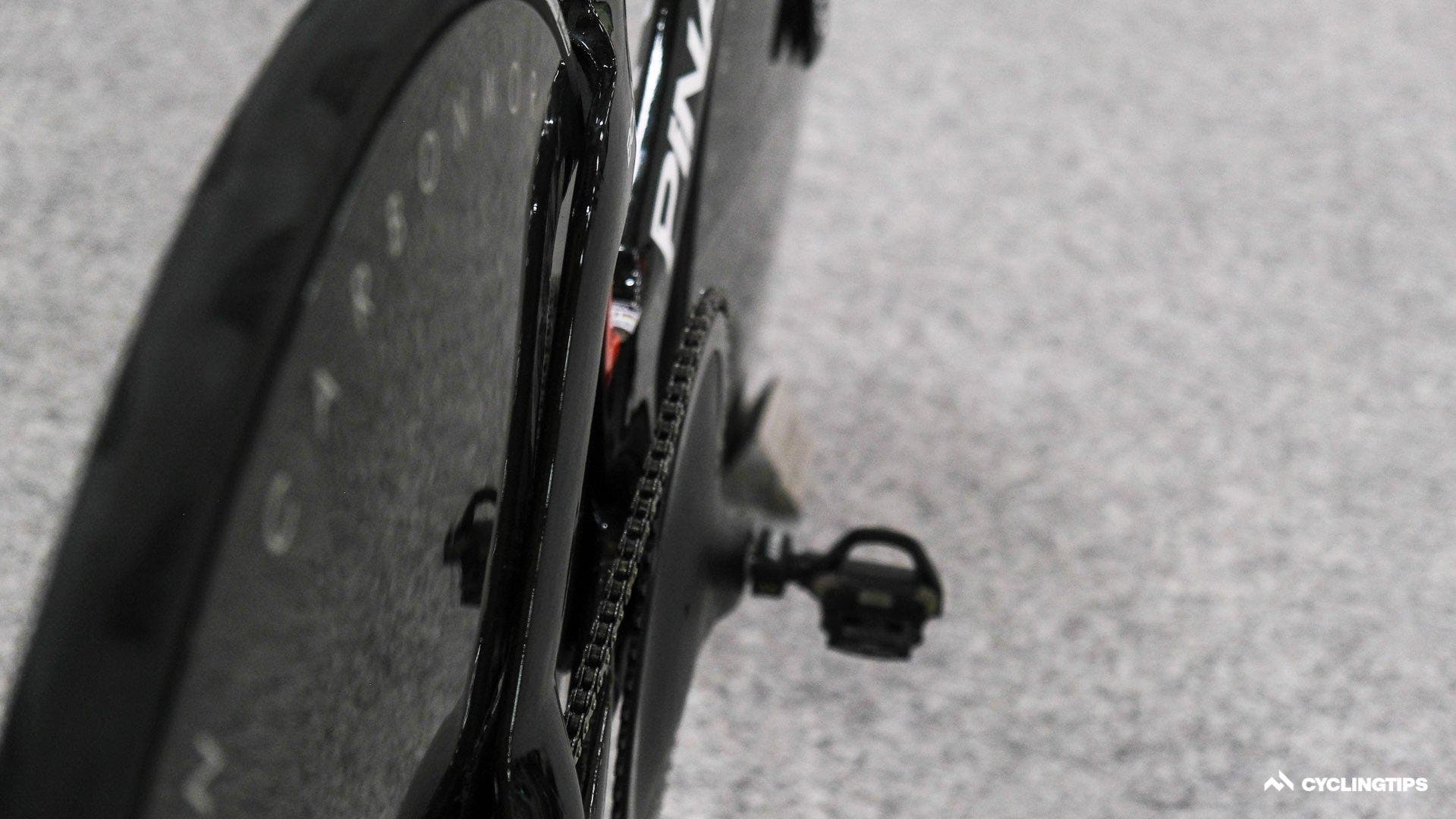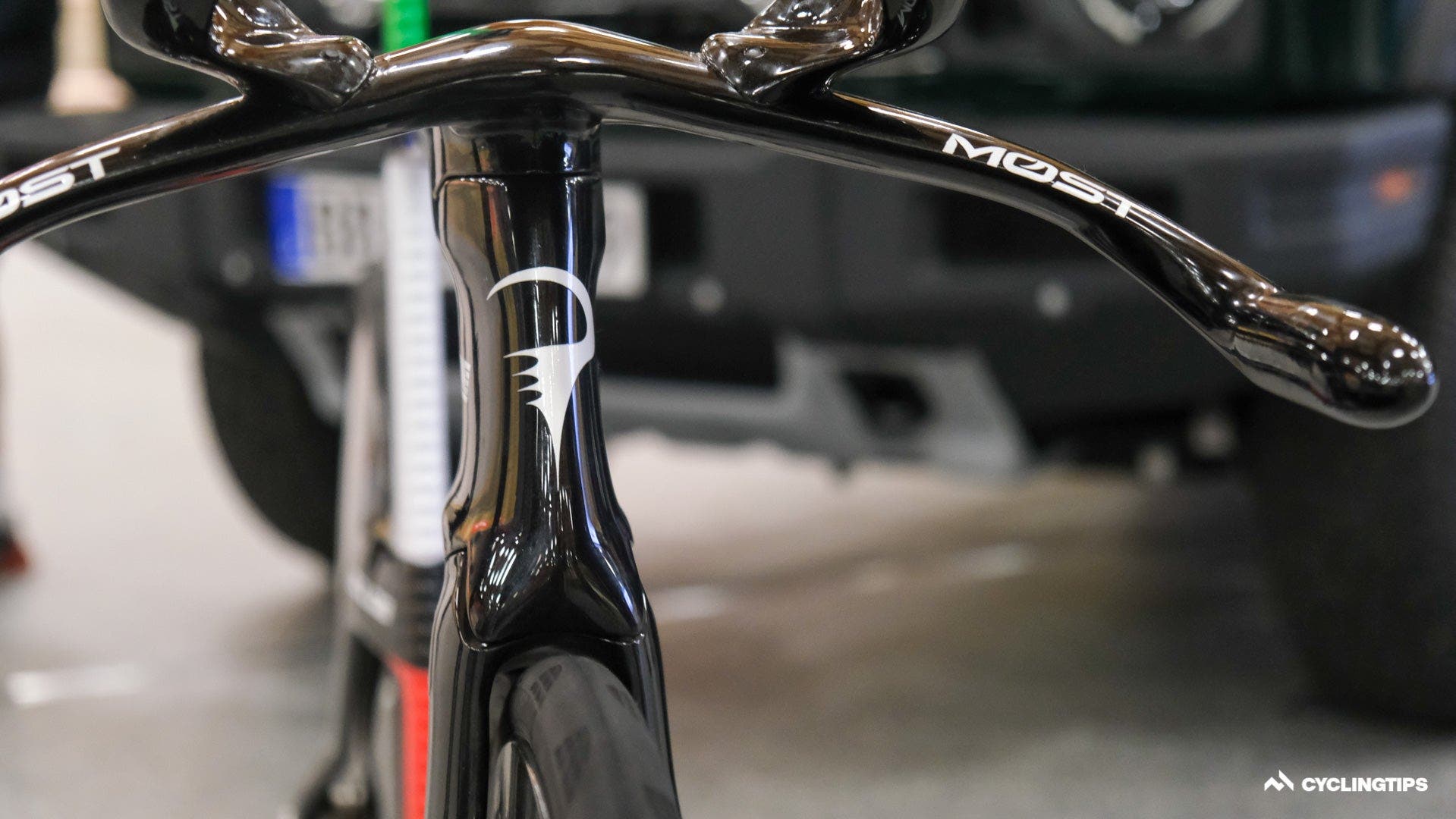 Done and dusted. After two new world records in the space of two months, 56.792 km will surely stand for quite a while.Top Ganna by name, the top-est rider of all time by nature.The Bolide moniker has donned several innovative Pinarello aero frames over the past decade, but this latest iteration, a 3D printed, humpback whale inspired, ultra-narrow track bike must surely be the most innovative of all?The humpback whale tubercle-mimicking ridges on the seat tube and down tube are said to help the airflow coming off the rider’s legs to attach to the aero profiled tubes and significantly reduce the drag of the overall rider and bike system.The relatively deep ridges generate vortices in the troughs between the bumps on the seat tube, helping reduce airflow separation and hence the drag on the frame.The new bike is also incredibly narrow. Pinarello focused on reduced frontal area as one way of further reducing the aero drag on the bike.It’s remarkable just how narrow the new front end is…Could barely slide a fiver in between that fork and disc wheel.As narrow as the gap between fork and wheel are…The 2mm between hub shell and fork leg is quite incredible. Furthermore, it’s not just a small gap between the fork and hubs, the hubs themselves are significantly narrower than standard hubs at just 69 mm (down from 100 mm) wide at the front and 89 mm (down from 120 mm) at the rear. Presumably the hubs were oiled rather than greased, the same setup Bigham used for his successful attempt in August.It’s the same out back, the Bolide is so narrow it could almost slide between a wall and a picture frame.Such a narrow bike needed narrower wheels, and Princeton Carbon Works created these bike-specific wheels for the Hour Record project. In fact, the wheels and hubs were designed for optimal efficiency in terms of both shape and width with the bike dropouts then made to match.It’s not just about going fast, Ganna wanted to look good too. These Top Ganna chrome decals certainly tick that box.Every aspect of frame, fork and wheel integration was considered. The head tube nose cone flows onto the fork head, which in turn flows onto the down tube, all in a way that complies with the UCI regulations. While the front wheel hugs the down tube cutout as close as possible.The tyres are also narrow. 23 mm Continental GP 5000 TTs got the nod, and bulge out on the wide disc to almost seamlessly integrate with the disc wheel. Ganna was riding the same clincher setup as used by Bigham back in August, with pressures said to be “not quite the 15 bar you might put in a track tub, but significantly higher than you would run on the road.”Narrow and deep, that’s the magic recipe for an aero profile. Head on, the frame and fork are extremely narrow, viewed from the side the tubes are very deep to improve the airflow over the bike and reduce drag.Ganna’s bars are also custom made and 3D printed specifically for the new world record holder. The base bar is narrow and profiled, but it’s the extensions that are perhaps most interesting. The kinked risers are actually an aerodynamic intervention, designed to control the airflow onto Ganna’s legs and reduce the overall drag on the bike and rider system as a whole.These channels in the elbow-like risers direct the airflow as it comes off the riser.The exact shape of the extensions is designed to perfectly match Ganna’s forearms, maximise aerodynamic efficiency while still complying with the UCI regulations. The “elbow rests” are relatively high on the extension, presumably to bring the rests in line with the UCI’s 10 cm maximum height difference between the elbow support point and the highest point of the extension. As such, Ganna actually rests his forearms on the extensions rather than his elbows, it’s a position commonly adopted by those pushing right to the limits of the UCI regulations.The grips themselves are different from the mesh-like grips Ganna has used on the road this year.Sticking with big and narrow, Ganna used a Wattshop Cratus Aero modular crankset with a huge 65-tooth front chainring.The crank arms are again phenomenally narrow as is the Q-Factor at just 134 mm. The crank lengths are adjustable, and while we don’t know which length Ganna opted for, the cranks offer anything from 160 mm right the way up to 175 mm, with the usual 2.5 mm jumps in lengths.But again, what is narrow head on, is relatively huge when viewed from the side. Aero is everything and the Wattshop Cratus cranks are effectively one large aero profile with a great big chainring stuck to it. The chainrings themselves are low friction additive infused 1/8” track chainring. While the stepped edge chainring design ensures the outer plates of the chain sit flush with the chainring to reduce air-flow separation.Ganna didn’t just have one bike, though. UCI regulations state all Hour Record attempts must have two approved bikes on site. The bike Ineos Grenadiers presented for photographs was actually Ganna’s spare bike, we did of course grab some photos of the actual record bike also.The race bike was practically identical to spare bike, bar the inclusion of power meter pedals and a Garmin mounted under the saddle.Oh, and a name badge seat post height marker.The race bike was taken for a UCI check immediately post ride. This is the scene just moments after the finish with the cranks removed and a UCI commissaire on site presumably for some form of motor check. The motor (Ganna himself) had already dismounted the bike.Ganna resisted the temptation of Speedplay Aero pedals used so often for track record attempts, and instead opted for Favero’s Assioma Shi power meter pedals. The Assioma Shi do add a considerable 13 mm to the system Q-Factor, but I guess when the bottom bracket of your 3D-printed track bike and the Q-Factor of your matching aero cranks is already so far reduced, the extra 13 mm might just bring the power pedals back up to a normal width. No doubt D