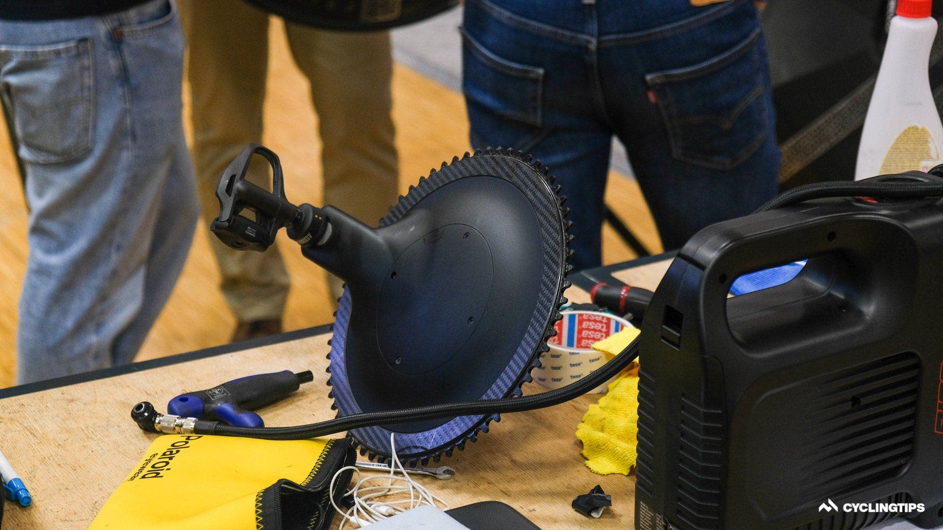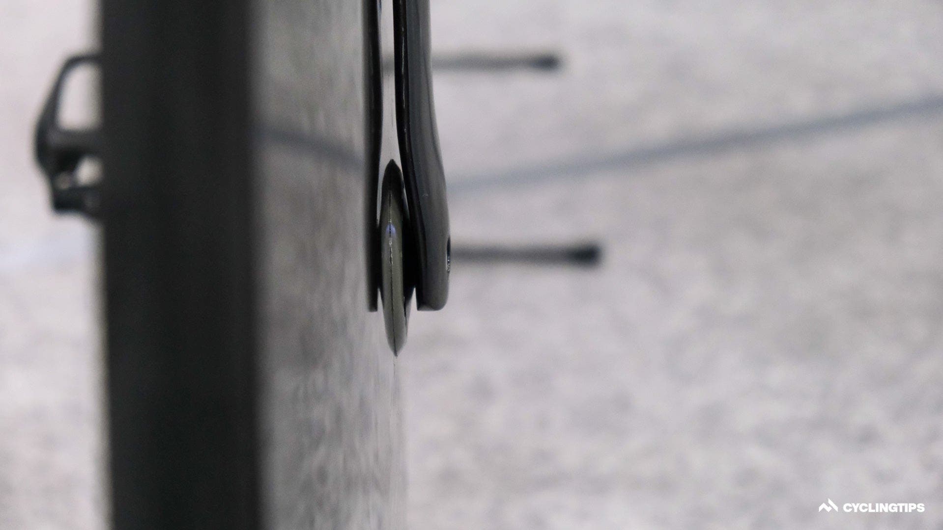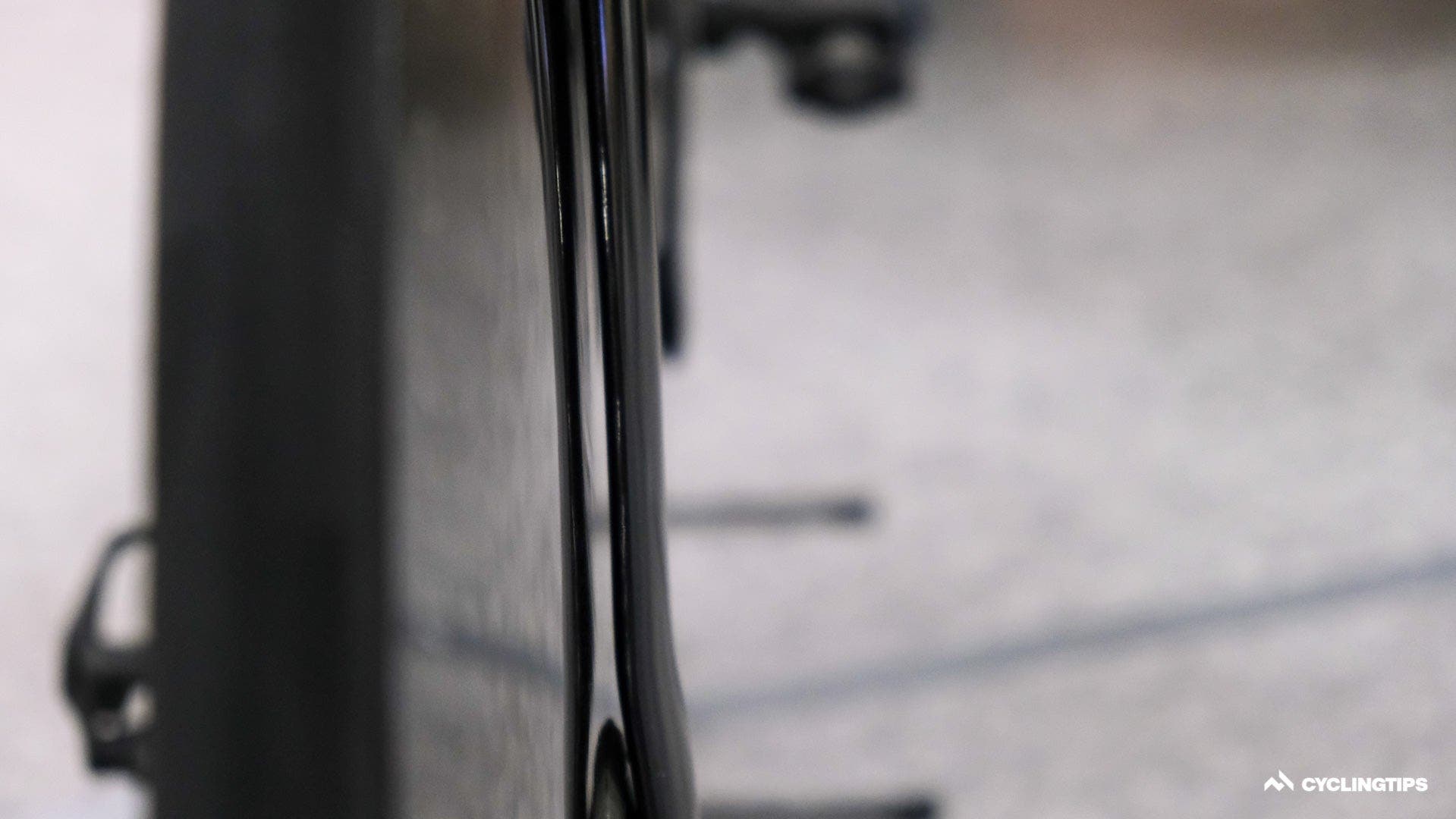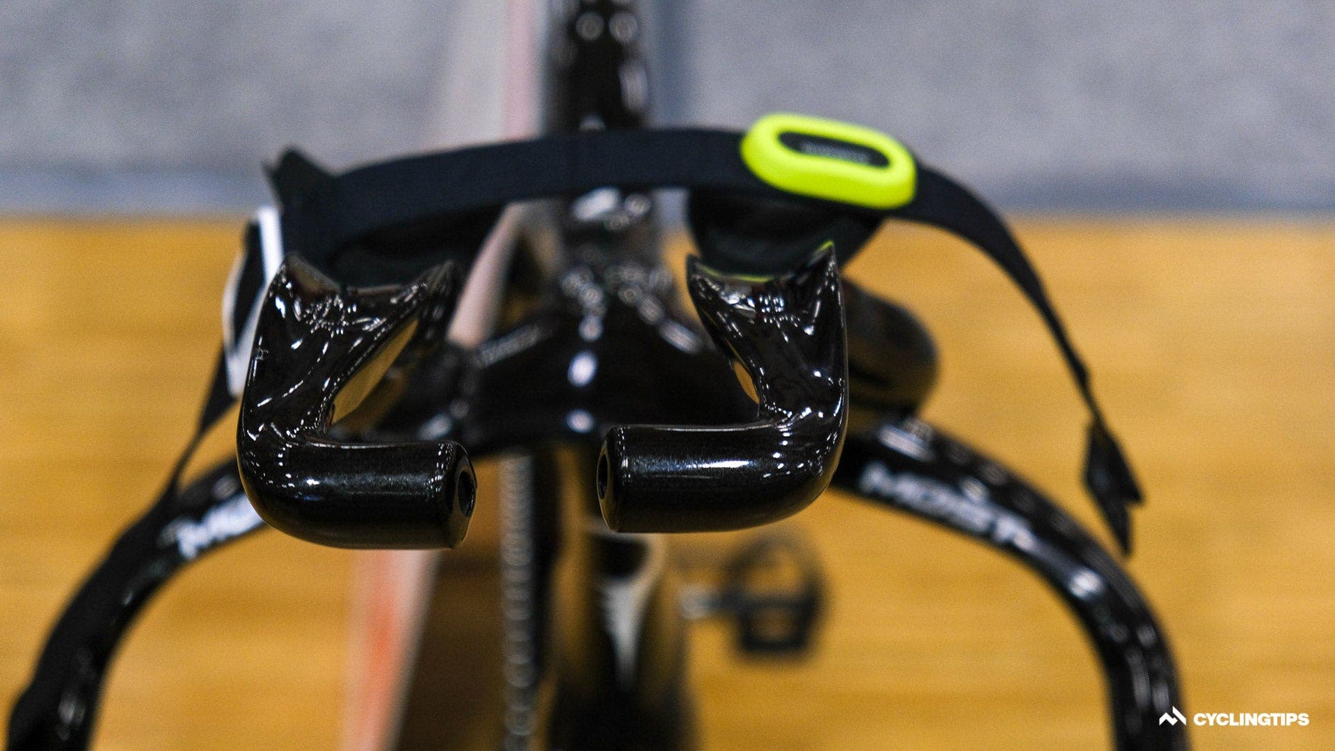 Done and dusted. After two new world records in the space of two months, 56.792 km will surely stand for quite a while.Top Ganna by name, the top-est rider of all time by nature.The Bolide moniker has donned several innovative Pinarello aero frames over the past decade, but this latest iteration, a 3D printed, humpback whale inspired, ultra-narrow track bike must surely be the most innovative of all?The humpback whale tubercle-mimicking ridges on the seat tube and down tube are said to help the airflow coming off the rider’s legs to attach to the aero profiled tubes and significantly reduce the drag of the overall rider and bike system.The relatively deep ridges generate vortices in the troughs between the bumps on the seat tube, helping reduce airflow separation and hence the drag on the frame.The new bike is also incredibly narrow. Pinarello focused on reduced frontal area as one way of further reducing the aero drag on the bike.It’s remarkable just how narrow the new front end is…Could barely slide a fiver in between that fork and disc wheel.As narrow as the gap between fork and wheel are…The 2mm between hub shell and fork leg is quite incredible. Furthermore, it’s not just a small gap between the fork and hubs, the hubs themselves are significantly narrower than standard hubs at just 69 mm (down from 100 mm) wide at the front and 89 mm (down from 120 mm) at the rear. Presumably the hubs were oiled rather than greased, the same setup Bigham used for his successful attempt in August.It’s the same out back, the Bolide is so narrow it could almost slide between a wall and a picture frame.Such a narrow bike needed narrower wheels, and Princeton Carbon Works created these bike-specific wheels for the Hour Record project. In fact, the wheels and hubs were designed for optimal efficiency in terms of both shape and width with the bike dropouts then made to match.It’s not just about going fast, Ganna wanted to look good too. These Top Ganna chrome decals certainly tick that box.Every aspect of frame, fork and wheel integration was considered. The head tube nose cone flows onto the fork head, which in turn flows onto the down tube, all in a way that complies with the UCI regulations. While the front wheel hugs the down tube cutout as close as possible.The tyres are also narrow. 23 mm Continental GP 5000 TTs got the nod, and bulge out on the wide disc to almost seamlessly integrate with the disc wheel. Ganna was riding the same clincher setup as used by Bigham back in August, with pressures said to be “not quite the 15 bar you might put in a track tub, but significantly higher than you would run on the road.”Narrow and deep, that’s the magic recipe for an aero profile. Head on, the frame and fork are extremely narrow, viewed from the side the tubes are very deep to improve the airflow over the bike and reduce drag.Ganna’s bars are also custom made and 3D printed specifically for the new world record holder. The base bar is narrow and profiled, but it’s the extensions that are perhaps most interesting. The kinked risers are actually an aerodynamic intervention, designed to control the airflow onto Ganna’s legs and reduce the overall drag on the bike and rider system as a whole.These channels in the elbow-like risers direct the airflow as it comes off the riser.The exact shape of the extensions is designed to perfectly match Ganna’s forearms, maximise aerodynamic efficiency while still complying with the UCI regulations. The “elbow rests” are relatively high on the extension, presumably to bring the rests in line with the UCI’s 10 cm maximum height difference between the elbow support point and the highest point of the extension. As such, Ganna actually rests his forearms on the extensions rather than his elbows, it’s a position commonly adopted by those pushing right to the limits of the UCI regulations.The grips themselves are different from the mesh-like grips Ganna has used on the road this year.Sticking with big and narrow, Ganna used a Wattshop Cratus Aero modular crankset with a huge 65-tooth front chainring.The crank arms are again phenomenally narrow as is the Q-Factor at just 134 mm. The crank lengths are adjustable, and while we don’t know which length Ganna opted for, the cranks offer anything from 160 mm right the way up to 175 mm, with the usual 2.5 mm jumps in lengths.But again, what is narrow head on, is relatively huge when viewed from the side. Aero is everything and the Wattshop Cratus cranks are effectively one large aero profile with a great big chainring stuck to it. The chainrings themselves are low friction additive infused 1/8” track chainring. While the stepped edge chainring design ensures the outer plates of the chain sit flush with the chainring to reduce air-flow separation.Ganna didn’t just have one bike, though. UCI regulations state all Hour Record attempts must have two approved bikes on site. The bike Ineos Grenadiers presented for photographs was actually Ganna’s spare bike, we did of course grab some photos of the actual record bike also.The race bike was practically identical to spare bike, bar the inclusion of power meter pedals and a Garmin mounted under the saddle.Oh, and a name badge seat post height marker.The race bike was taken for a UCI check immediately post ride. This is the scene just moments after the finish with the cranks removed and a UCI commissaire on site presumably for some form of motor check. The motor (Ganna himself) had already dismounted the bike.Ganna resisted the temptation of Speedplay Aero pedals used so often for track record attempts, and instead opted for Favero’s Assioma Shi power meter pedals. The Assioma Shi do add a considerable 13 mm to the system Q-Factor, but I guess when the bottom bracket of your 3D-printed track bike and the Q-Factor of your matching aero cranks is already so far reduced, the extra 13 mm might just bring the power pedals back up to a normal width. No doubt D