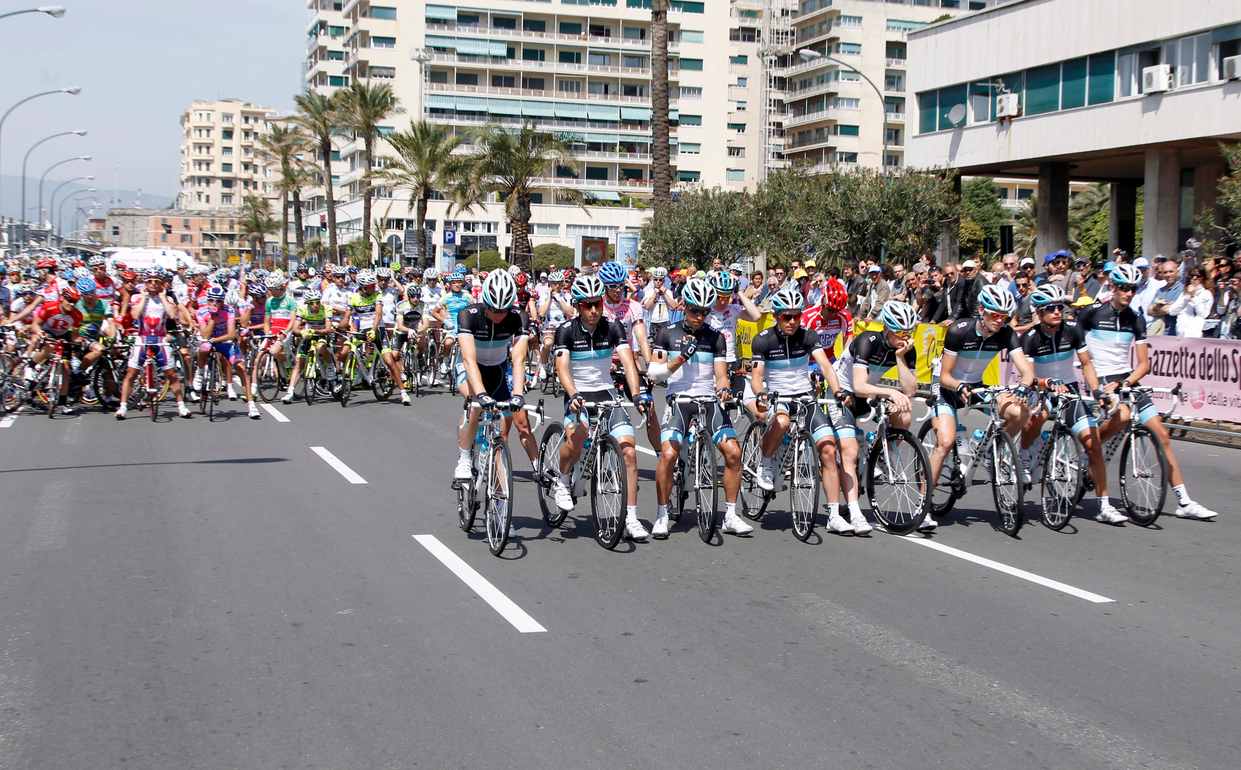 Teams lined up at the start line in Genoa, beginning with a moment of silence to honor the Belgian rider. Teams agreed that they would ride at the front for 10 kilometers each, with Leopard-Trek getting the honors of crossing the line first.