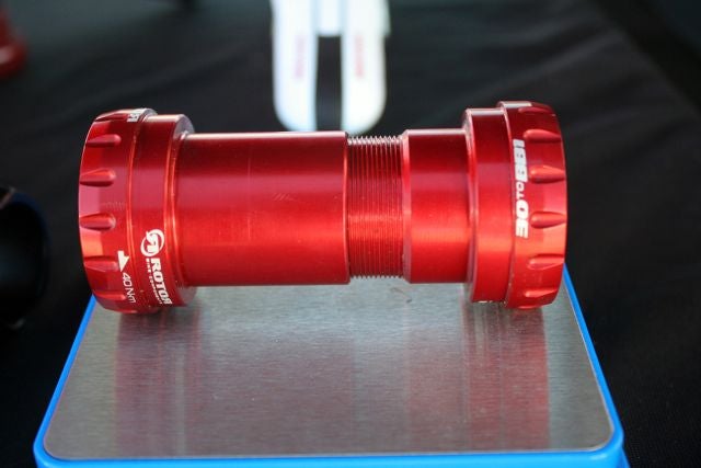 Rotor presented a elegant solution to issue of multiple bottom bracket standards with its new BB30 to 24mm (Shimano-compatible) reduction bottom bracket, designed to self-press into press-fit BB30 frames. By working the adapter into the bottom bracket itself, Rotor eliminates the clunky, and often loud, adapters. The two sides of the bottom bracket simply thread together, press fitting into the frame as they do so. A steel-bearing version will be available for 2011 for $75, ceramic for $150.
