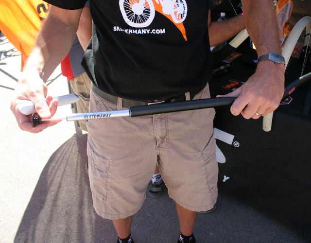 The Stowaway, as the latter is aptly named, will be available for 2011 and will retail for $22. It fits snugly, and rattle-free, inside most mountain bike handlebars, with the end of the pump replacing the bar’s end-cap. Due to its small size, filling high volume tires might take a little while, but Mark Burgener at SKS says he can still get one filled in about two and a half minutes. The pump maxes out at 90psi.