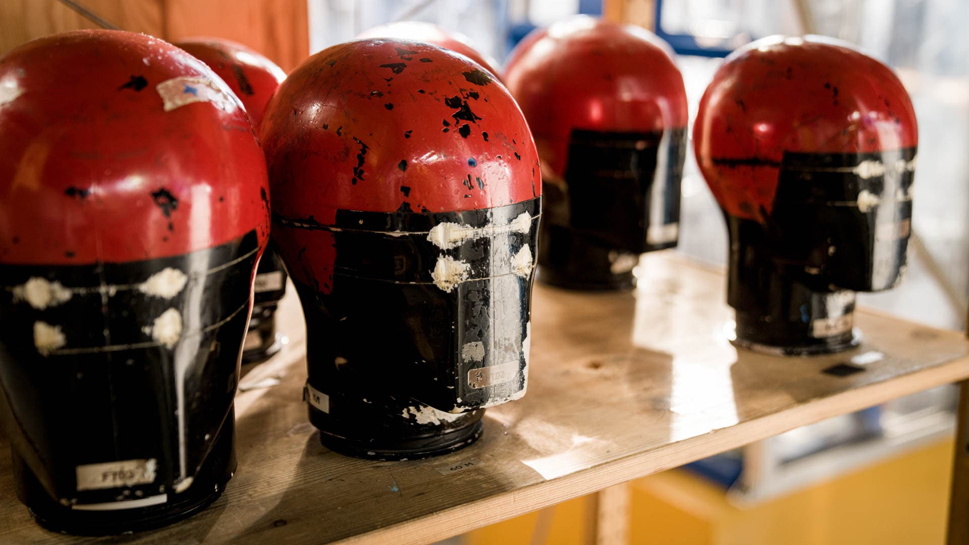The KG11 test itself isn’t anything out of the ordinary. An instrumented EN960 headform is fixed within the test helmet, which is positioned on a guided sled situated approximately 2 m above the impact point. Target impact speed is 6 m/s. The steel impact anvil is flat, angled at 45°, and covered with 80-grit sandpaper to repeatably induce rotational force upon impact. Inside the headform are three linear accelerometers and three angular rate sensors, all transmitting wirelessly to eliminate any unwanted effects of an attached wiring harness. Each helmet model is tested at four different impact points.