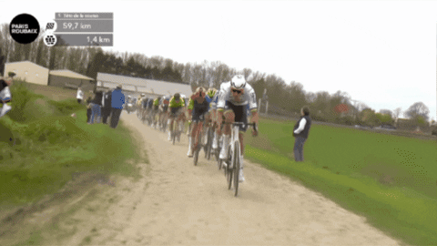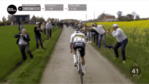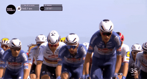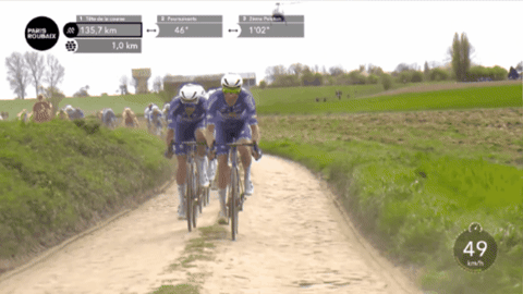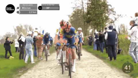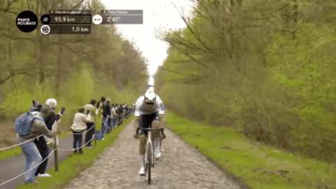 160km-to-go: As soon as the cobbled sectors begin, Mathieu van der Poel’s Alpecin team uses their combination of superior technical skill, power, and just plain physical size to mass at the front. This lets them pick their own line over the cobblestones, set a hard pace to fatigue their leader’s rivals and reduce flats since they can pick cleaner lines over the rough cobbles.