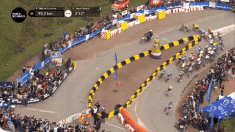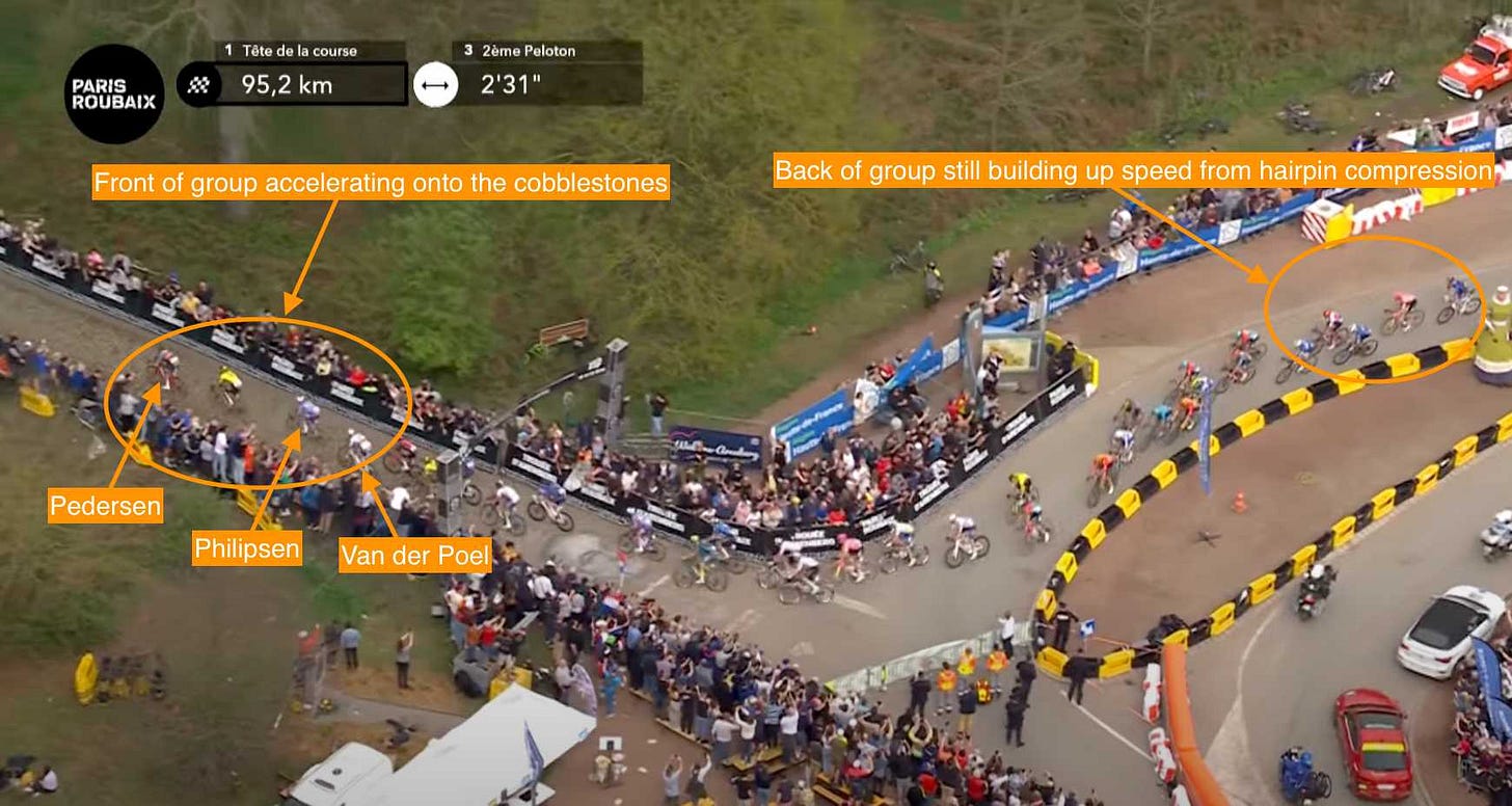 95.4km: After a high-speed sprint into the new Arenberg Forest chicane, we can immediately see just how much the compression of the slowing, accelerating group gives the advantage to those who entered at the front as those at the back nearly slow to stop.