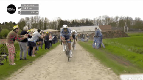 59.6km: Once Van der Poel is clear of the field, he throws down an unbelievable amount of power to get up to speeds approaching 40mph. The fact he can do this over extremely rough cobblestones, all while looking incredibly smooth, shows just how talented of a rider he is and why he is nearly unbeatable in these conditions.