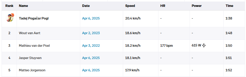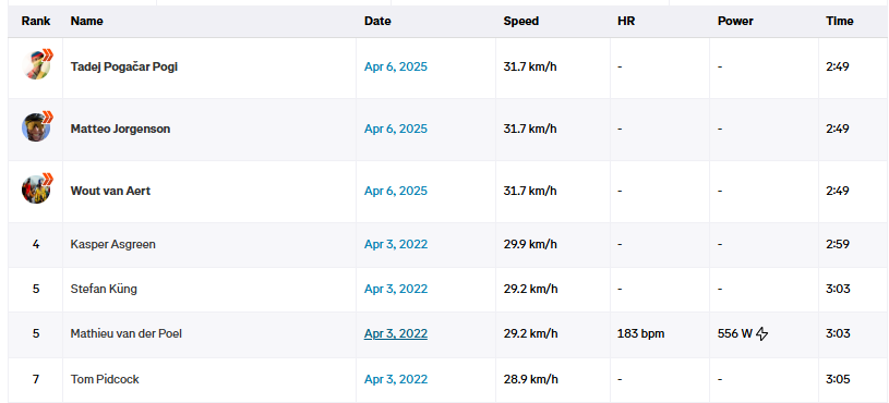 This was the fastest Oude Kwaremont ever recorded, with Pogačar taking the Strava KOM in a time of two minutes and 49 seconds.