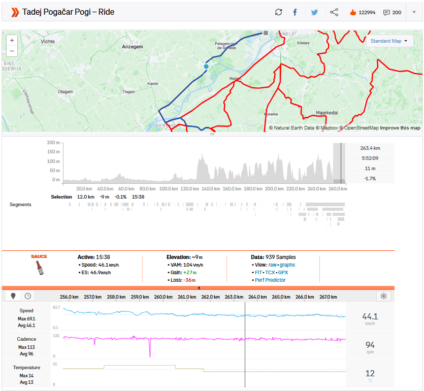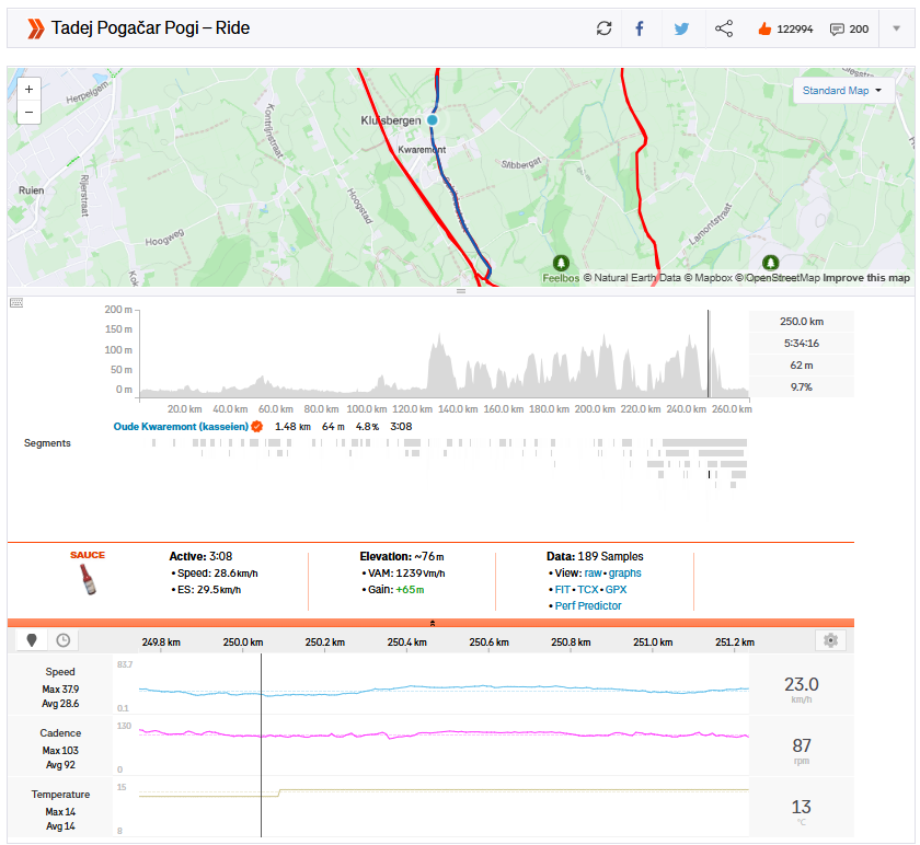 Isolated with over 40 km to go, Pogačar continued attacking in an attempt to split the group. His attack on the Koppenberg was enough to take the Strava KOM with a ridiculous time of one minute and 38 seconds.