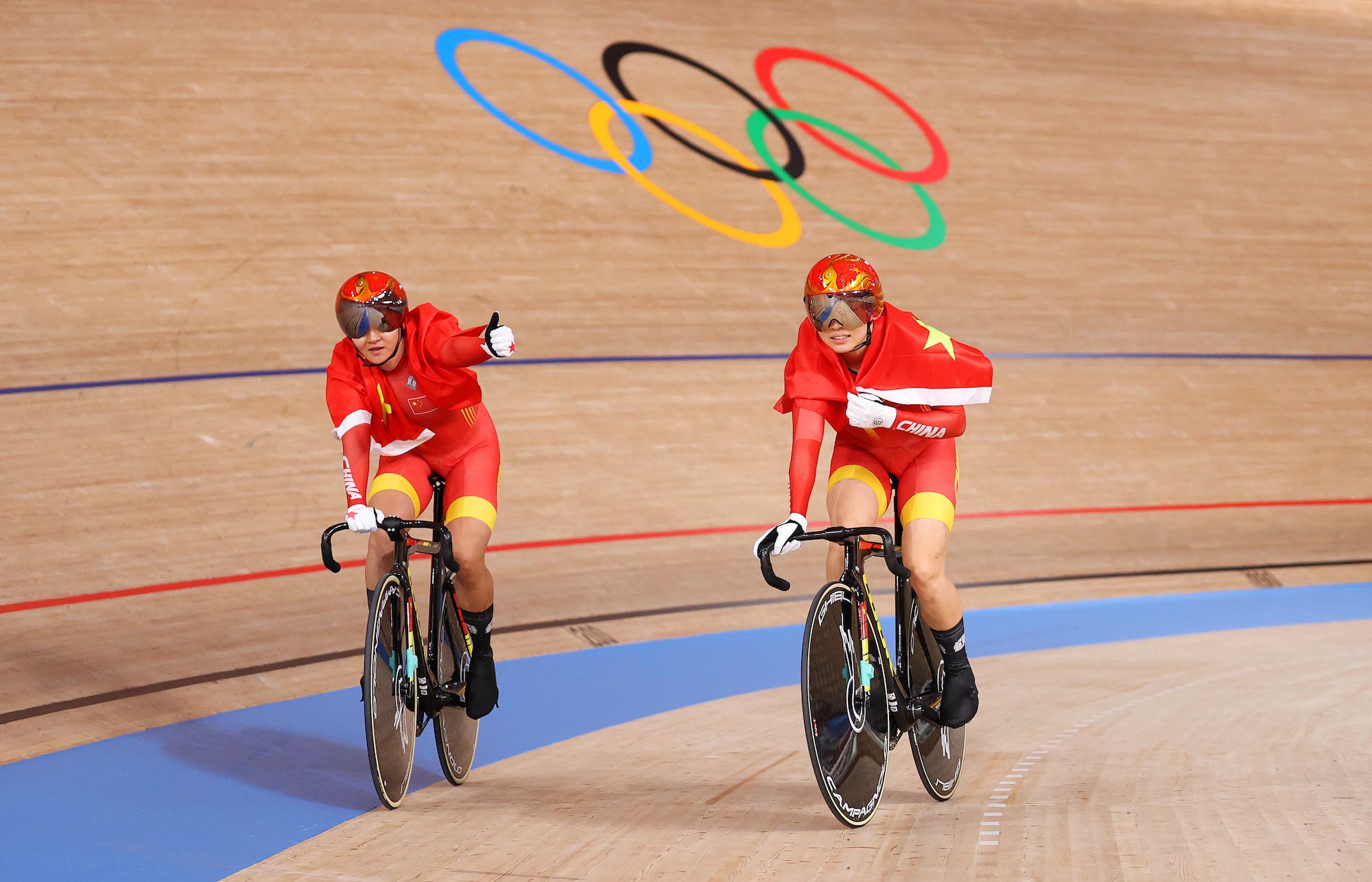 The Chinese pair set a new world and Olympic record with a time of 31.804 in their qualifying round and went on to race a red-hot second lap to edge out Germany’s Emma Hinze and Sophie Friedrich in a thrilling final race for gold.