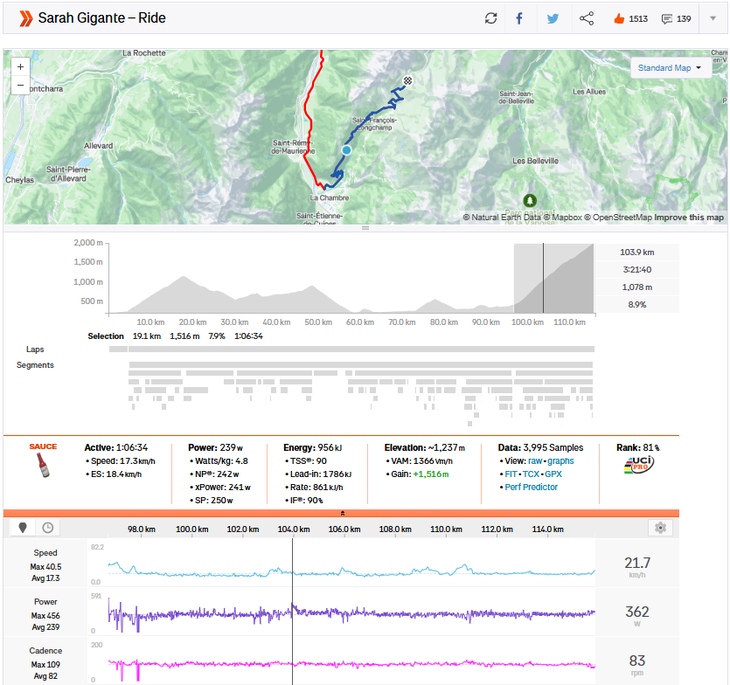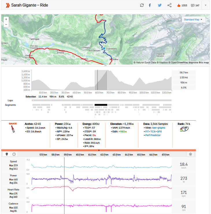 Looking at the power data, it’s clear that no one (apart from Ferrand-Prévot, perhaps) had the same legs as they did on the Col de la Madeleine. There were attacks and splits everywhere, but Gigante’s climbing performance was about 10% lower than the previous day’s.