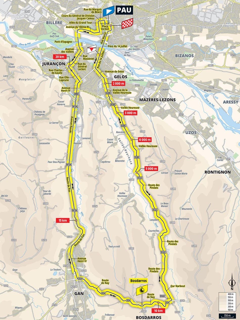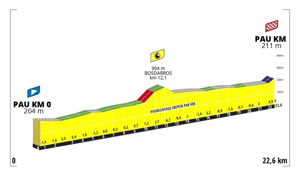 The ones that remain are the midpoint climb to Bosdarros (1.8 kilometers at 5.5 percent) and the uphill sprint to the finish in Pau (400 meters at 5.7 percent).