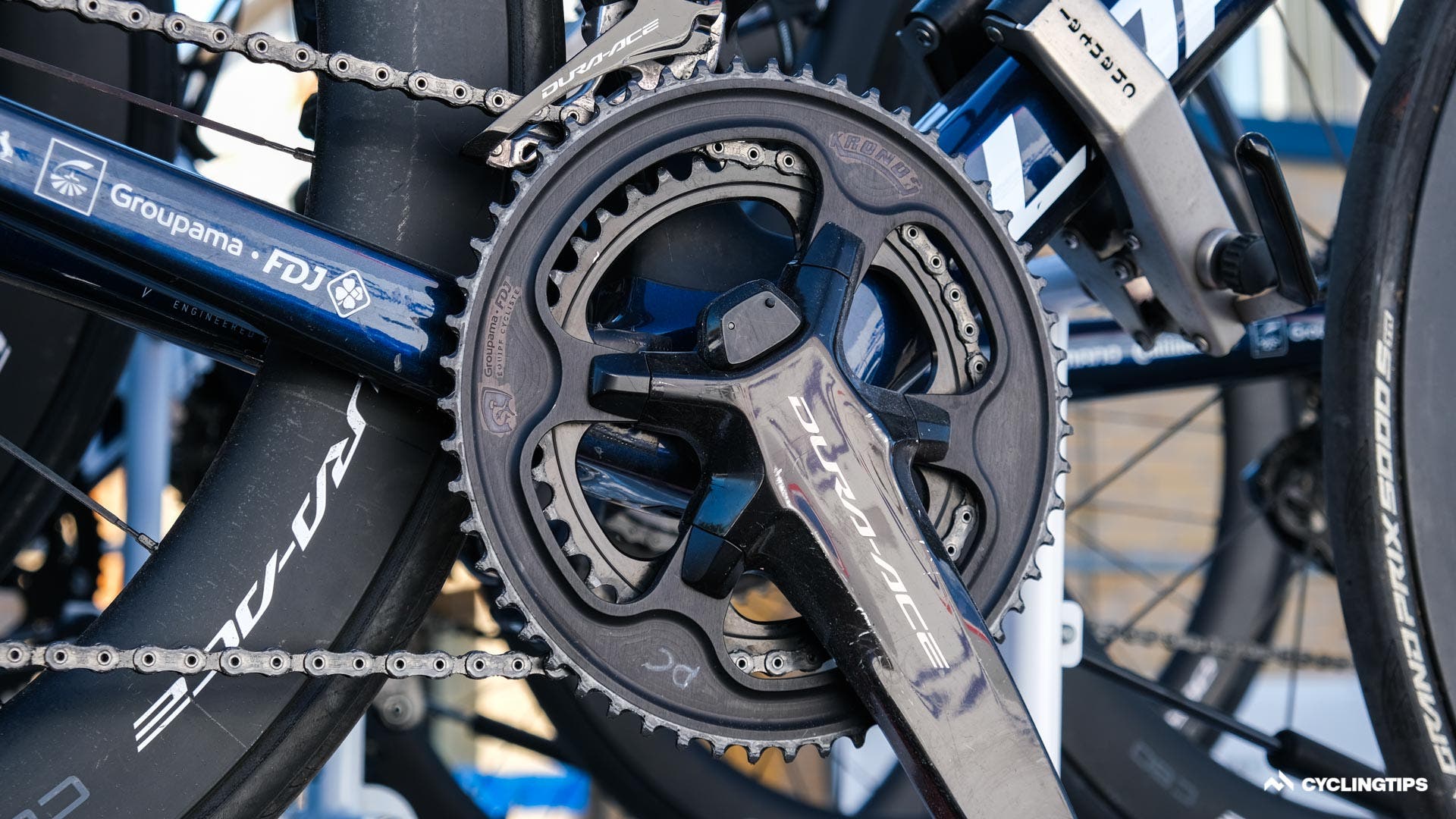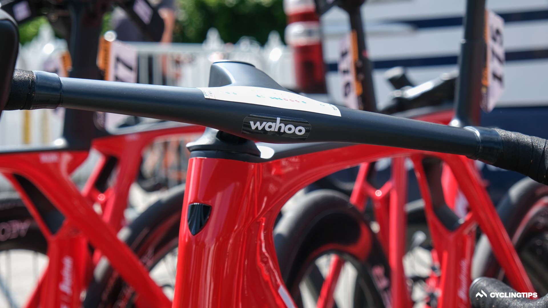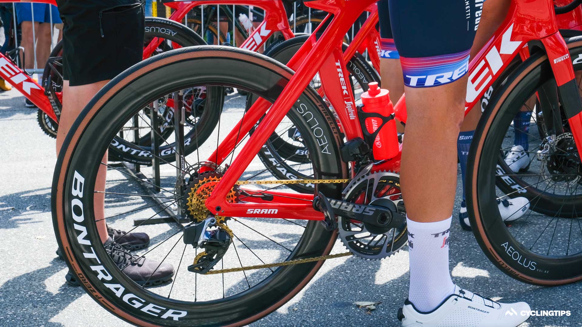The helmet seems to be a highly ventilated offering and presumably lightweight.The new helmet apparently is at least partly made with Trek’s OCLV carbon and perhaps that explains the change in branding.Rudy Project also had a new helmet on show today. The “Egos” was announced on the brand’s Instagram page and is said to offer safety, comfort, and “outstanding customisation.” SRAM has a gold chain for its former world champion Mads Pedersen …… with a gold cassette to match. SRAM also had a rainbow-coloured chain for Pedersen during his time in the rainbow jersey, and seemingly that rainbow chain will soon be available to the public. All the Groupama-FDJ riders, with the exception of Thibaut Pinot, raced with these 55-tooth chainrings from Kronos Sport.Wout van Aert decided to race on Vittoria’s Corsa Speed tyres, certainly a higher risk choice on Denmark’s roads which are known to cause more punctures than most. Specialized has been teasing a new tyre all season. But now the testing has ramped up a level, with the true identity almost visible through this slightly worn hotpatch. This Bahrain Victorious mechanic changed these brake pads phenomenally quickly moments before the start. Tadej Pogačar is racing with prototype Scicon glasses at the Tour. The glasses use aerodynamics in the opposite way than most new tech, with a hole in the lens directly in front of the frame said to channel airflow onto the face. Interestinly only Mads Pedersen and Jasper Stuyven are racing with the new Madone bar/stem. All six remaining riders are riding the new Madone with some other bar and stem two-piece combo or the Aelous cockpit from the Emonda. From what we understand, some riders’ unique stem length and bar width combinations were not yet available in the new one-piece bar/stem and so these riders were forced to race with an alternative setup. Other riders prefer a lighter weight option or perhaps don’t particularly like the flared drops of the new handlebar. Bauke Mollema opts to race without a head unit. He apparently doesn’t like to see the data during the stage. Mollema will have a head unit in his pocket to record his ride data, but there are no distractions up front. Interestingly, though, Mollema does like a route profile on his bars, strange given he won’t have a kilometre count on a head unit to correlate where he is at any given moment.Wout van Aert has stated he is targeting the green jersey in this year’s Tour de France and, although, technically only keeping it warm for Lampert, Wout’s bike was decked out with a green fork today. The mechanics will have to switch back to the yellow fork tonight ahead of Wout’s first day in yellow tomorrow.Dylan Van Baarle was about to set off with a new Garmin 1040, but he wasn’t happy with some setup on the screen and switched to a 100 plus before the off. It really was not -25 ºC. Jumbo-Visma mechanics had the power meter ID stuck to the top tube for easier head unit pairing.Quick-Step Alpha Vinyl has custom Wolfpack K-Edge headunit mounts. Geraint Thomas at least tried to warm down with Zwift, but seemingly couldn’t get logged on. Perhaps he had forgotten his password. Maybe he should have tried BrandAmbassador1.Mike Woods is racing with a Darimo saddle to help save every gram on his Factor Ostro VAM. It worked too, as you will see in a forthcoming article and video. Jakob Fuglsang went a step further to save a few grams and is racing with this bare carbon Selle Italia SLR saddle. Israel-Premier Tech riders also have a new integrated cockpit which looks incredibly neat. Don’t forget to check the spare bike tyre pressures. The team mechanics get mic’d up also. That way they can communicate with the team car in the event of a crash. Sometimes the mechanic and the car can get separated in the chaos and distance between spares and the crash site.