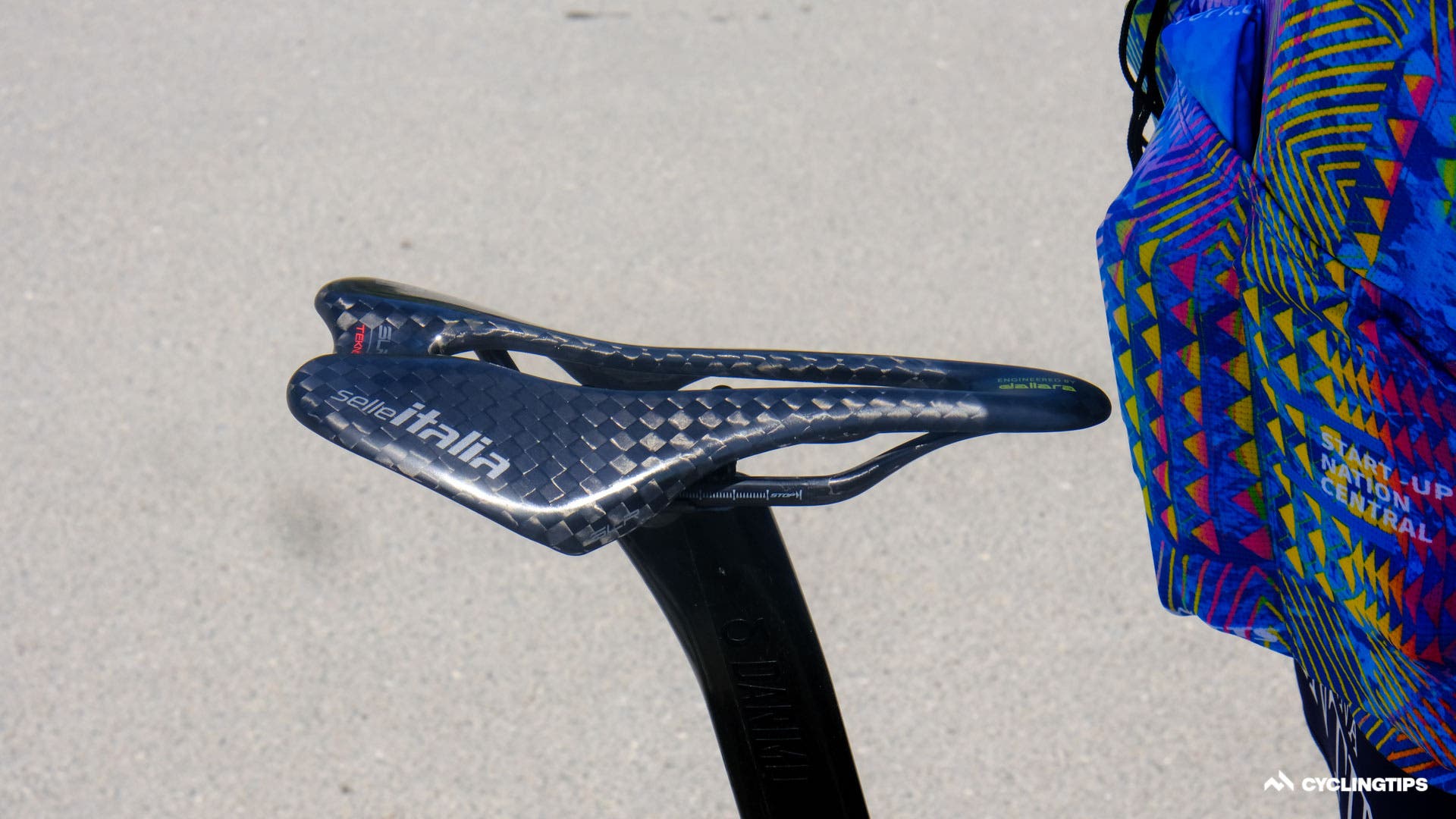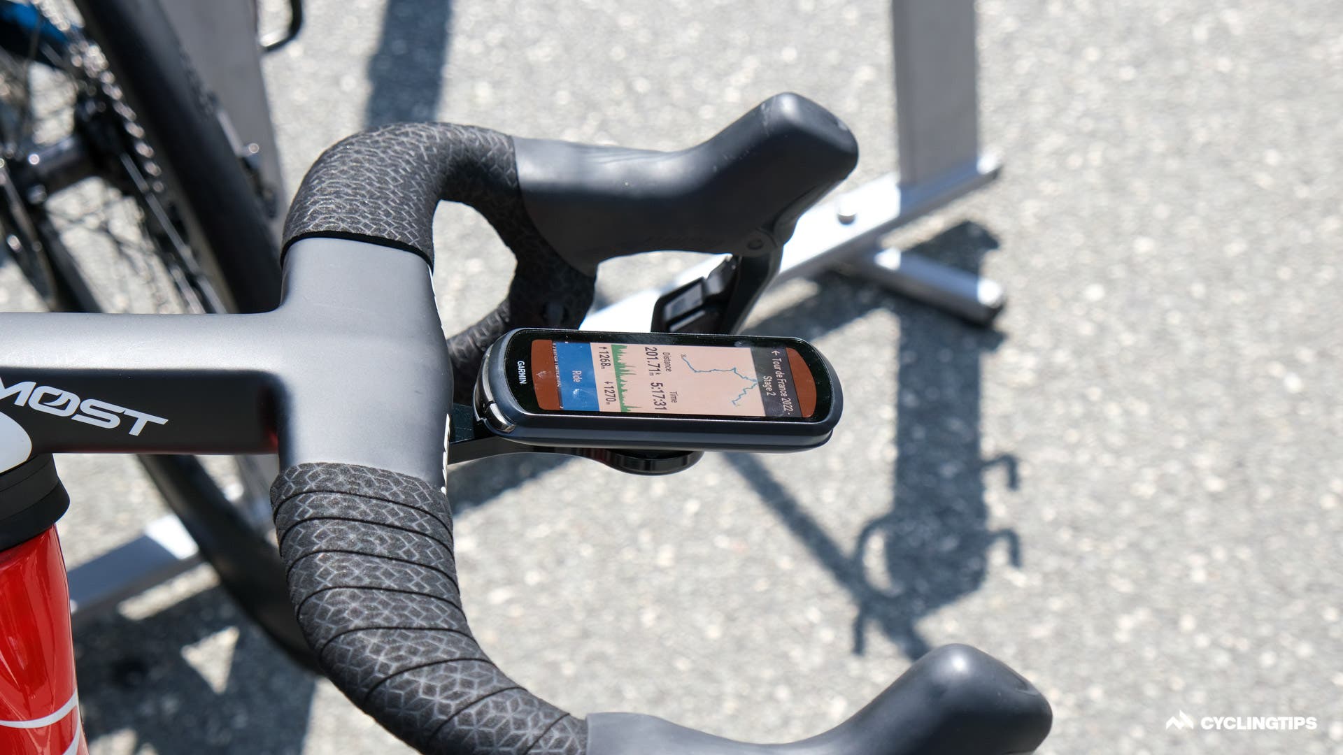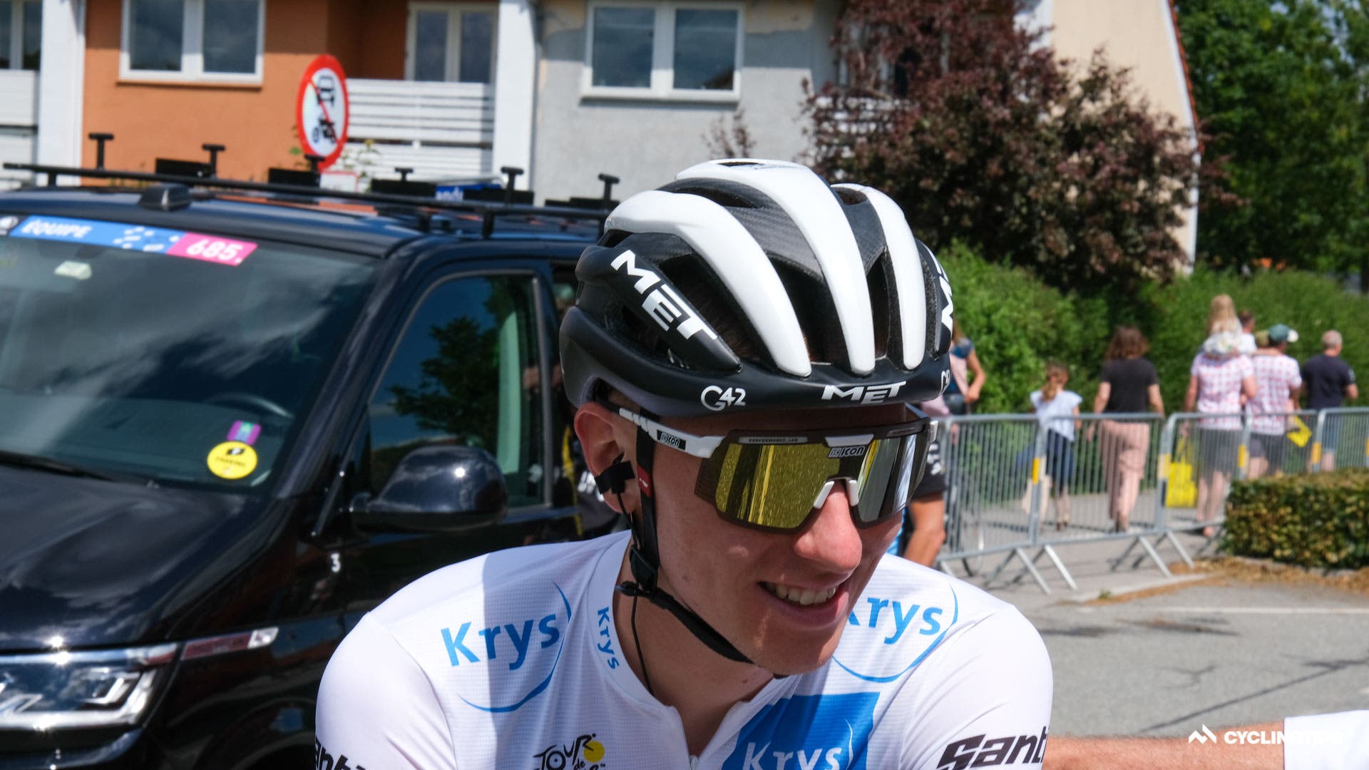 The helmet seems to be a highly ventilated offering and presumably lightweight.The new helmet apparently is at least partly made with Trek’s OCLV carbon and perhaps that explains the change in branding.Rudy Project also had a new helmet on show today. The “Egos” was announced on the brand’s Instagram page and is said to offer safety, comfort, and “outstanding customisation.” SRAM has a gold chain for its former world champion Mads Pedersen …… with a gold cassette to match. SRAM also had a rainbow-coloured chain for Pedersen during his time in the rainbow jersey, and seemingly that rainbow chain will soon be available to the public. All the Groupama-FDJ riders, with the exception of Thibaut Pinot, raced with these 55-tooth chainrings from Kronos Sport.Wout van Aert decided to race on Vittoria’s Corsa Speed tyres, certainly a higher risk choice on Denmark’s roads which are known to cause more punctures than most. Specialized has been teasing a new tyre all season. But now the testing has ramped up a level, with the true identity almost visible through this slightly worn hotpatch. This Bahrain Victorious mechanic changed these brake pads phenomenally quickly moments before the start. Tadej Pogačar is racing with prototype Scicon glasses at the Tour. The glasses use aerodynamics in the opposite way than most new tech, with a hole in the lens directly in front of the frame said to channel airflow onto the face. Interestinly only Mads Pedersen and Jasper Stuyven are racing with the new Madone bar/stem. All six remaining riders are riding the new Madone with some other bar and stem two-piece combo or the Aelous cockpit from the Emonda. From what we understand, some riders’ unique stem length and bar width combinations were not yet available in the new one-piece bar/stem and so these riders were forced to race with an alternative setup. Other riders prefer a lighter weight option or perhaps don’t particularly like the flared drops of the new handlebar. Bauke Mollema opts to race without a head unit. He apparently doesn’t like to see the data during the stage. Mollema will have a head unit in his pocket to record his ride data, but there are no distractions up front. Interestingly, though, Mollema does like a route profile on his bars, strange given he won’t have a kilometre count on a head unit to correlate where he is at any given moment.Wout van Aert has stated he is targeting the green jersey in this year’s Tour de France and, although, technically only keeping it warm for Lampert, Wout’s bike was decked out with a green fork today. The mechanics will have to switch back to the yellow fork tonight ahead of Wout’s first day in yellow tomorrow.Dylan Van Baarle was about to set off with a new Garmin 1040, but he wasn’t happy with some setup on the screen and switched to a 100 plus before the off. It really was not -25 ºC. Jumbo-Visma mechanics had the power meter ID stuck to the top tube for easier head unit pairing.Quick-Step Alpha Vinyl has custom Wolfpack K-Edge headunit mounts. Geraint Thomas at least tried to warm down with Zwift, but seemingly couldn’t get logged on. Perhaps he had forgotten his password. Maybe he should have tried BrandAmbassador1.Mike Woods is racing with a Darimo saddle to help save every gram on his Factor Ostro VAM. It worked too, as you will see in a forthcoming article and video. Jakob Fuglsang went a step further to save a few grams and is racing with this bare carbon Selle Italia SLR saddle. Israel-Premier Tech riders also have a new integrated cockpit which looks incredibly neat. Don’t forget to check the spare bike tyre pressures. The team mechanics get mic’d up also. That way they can communicate with the team car in the event of a crash. Sometimes the mechanic and the car can get separated in the chaos and distance between spares and the crash site.