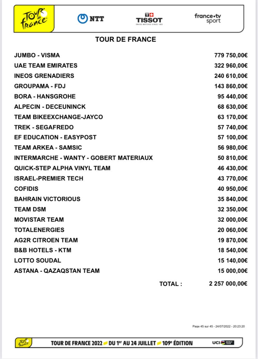 Tour-winner Jumbo-Visma won one-third of the entire pot with €779,750, with Vingegaard in the yellow and King of the Mountains jersey, Wout van Aert in green, and the team winning six stages across the 21 contested from Copenhagen to Paris.