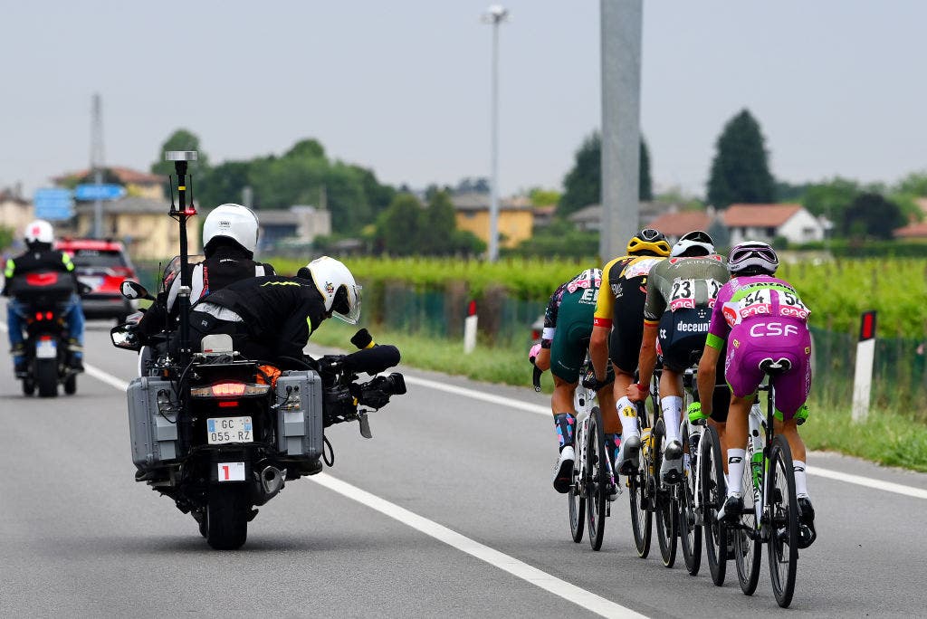 TV camera motorbikes often sit in front of race breakaways or the peloton, with occasional passes also taking place by motos carrying photographers.