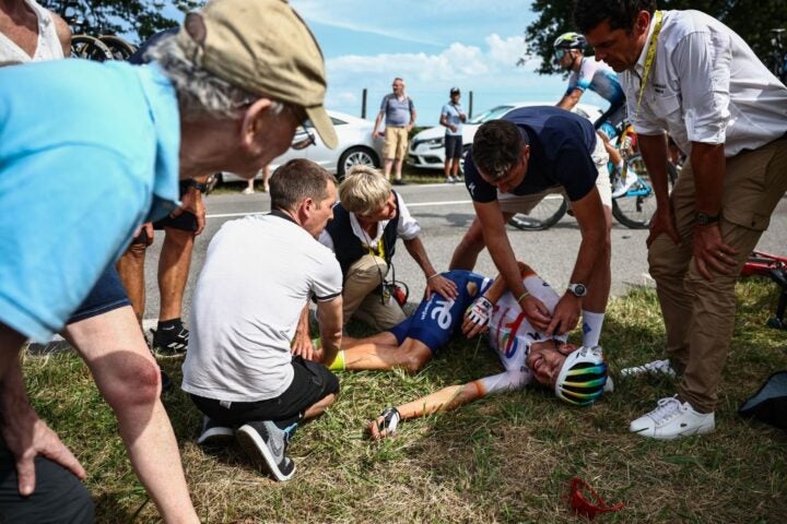 No broken bones were detected but he had multiple contusions on his hip and elbow—not the most welcome news for Cras, who exited last month’s Critérium du Dauphiné on stage 2 with a fractured elbow, which was the same injury, along with a broken scaphoid and finger, that cut short his Vuelta a España last year, also on stage 2.