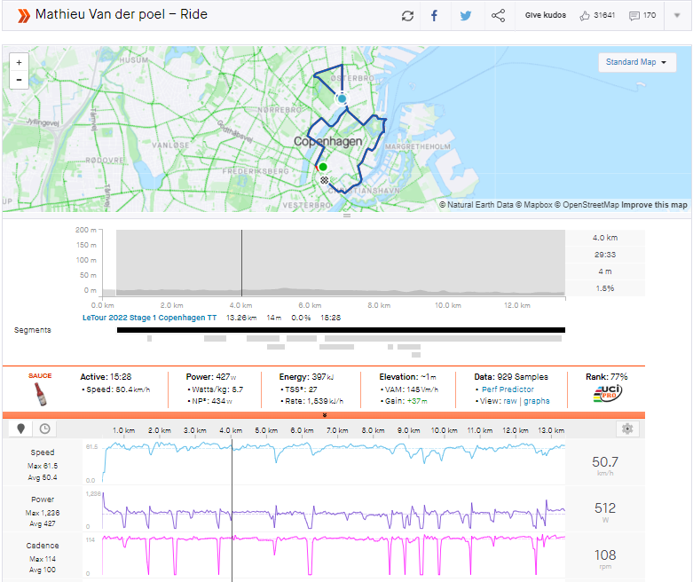 Van der Poel made it safely around the course and finished in a time of 15 minutes and 30 seconds, which put him in the provisional hot seat. The Dutchman’s power file shows us that this was no ordinary TT – he has to coast for nearly every corner, which meant that he had to sprint back up to speed and settle back into his aero bars.