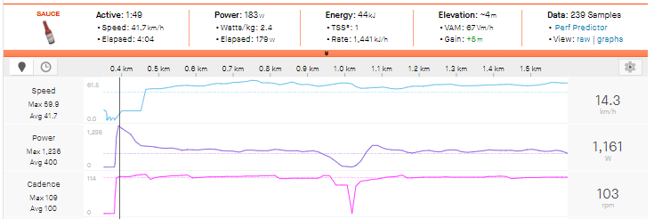 Sprint down the starting ramp: 1043w (13.9w/kg) for six seconds