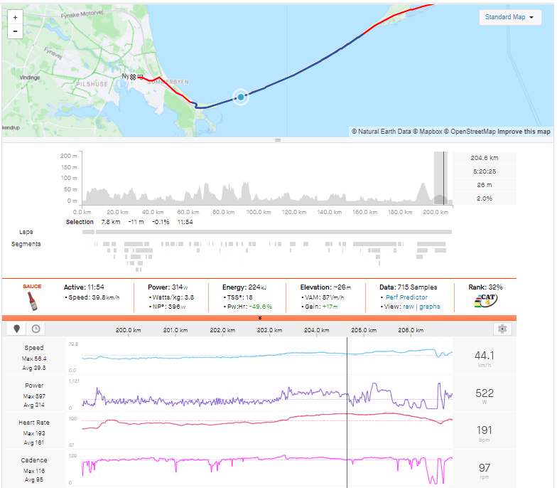 With this amount of corners in just 13.2km, there was hardly any time to settle in, and Van der Poel’s longest steady effort was just one minute and seven seconds before he had to slow down for a corner. I can count 15 spikes above 600w throughout Van der Poel’s time trial, which is the punchiest TT effort I have ever seen. In between corners, Van der Poel rode a very steady pace of 500w in the aero bars. However, he did start to fade in the more technical second half of the TT which most likely cost him the win.