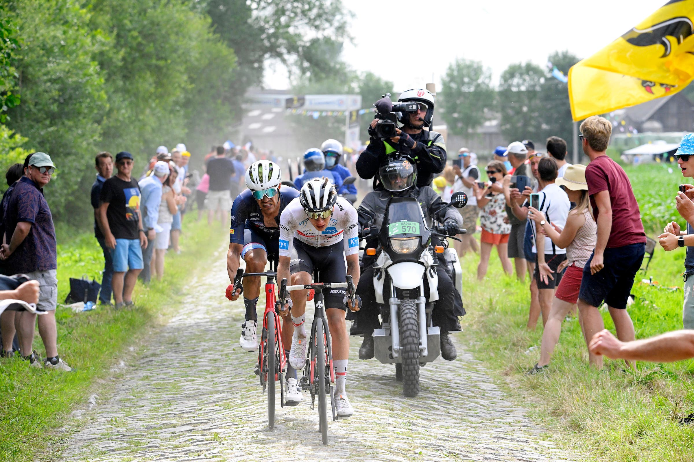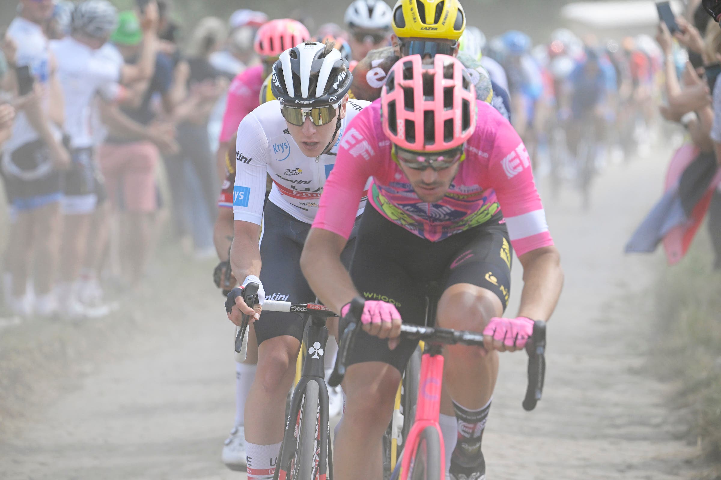 Somewhat inexplicably with two riders out front in the break, Alberto Bettiol (EF Education-EasyPost) drilled the peloton’s pace heading over the cobbles with defending Tour champion Tadej Pogačar (UAE Team Emirates) glued to his wheel. Jack Bauer and past world champion Mads Pedersen (Trek-Segafredo) attacked and opened a gap of 25 seconds over the bunch, but were reeled in.