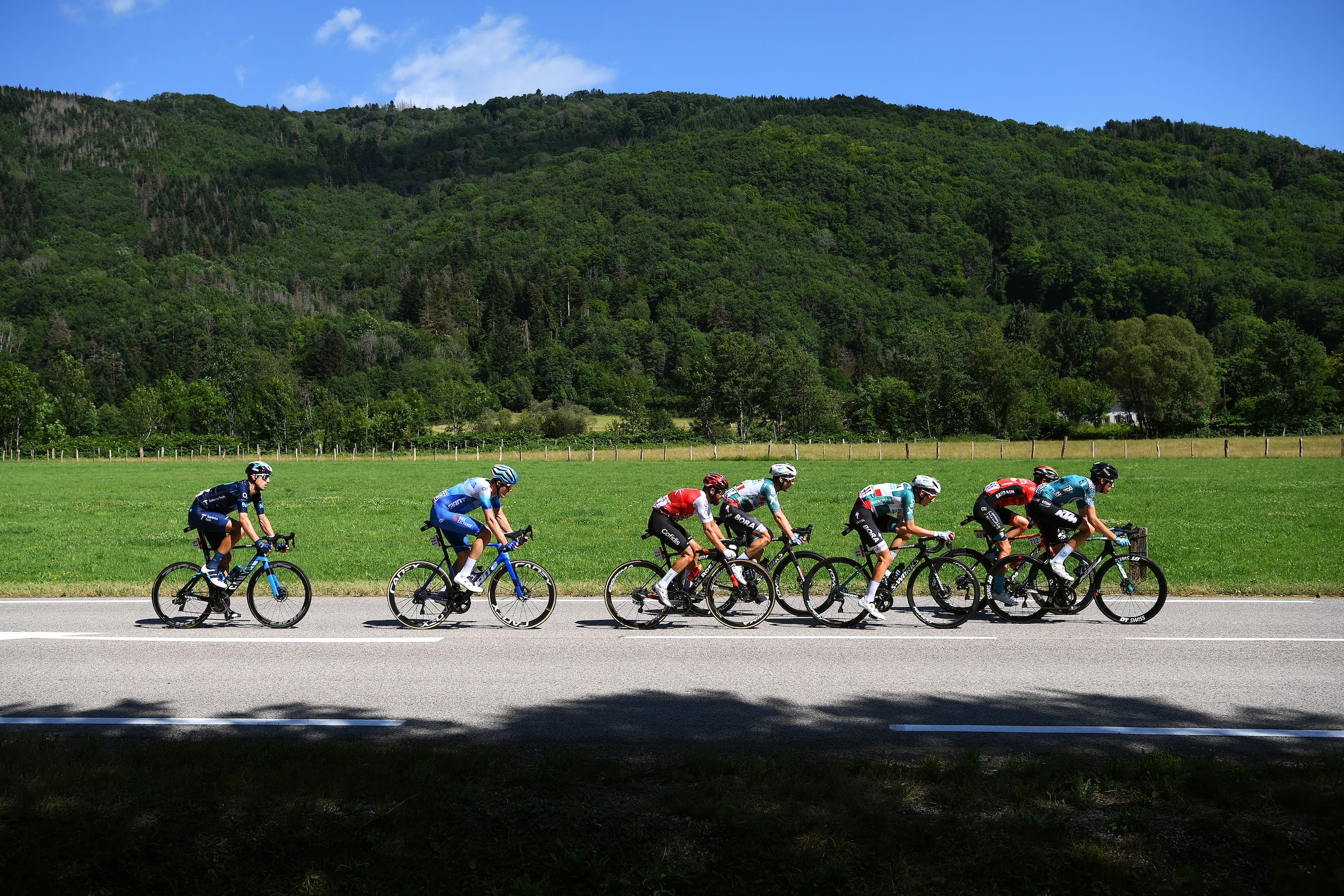 The Bora-Hansgrohe duo of Lennard Kämna and Maximilian Schachmann put the pressure on the break prior to the first of those categorized climbs, the cat 3 Col de Grosse Pierre, and were joined by Durbridge and, just before the summit, by Geschke and Teuns. Geschke and Kämna snagged the available points.