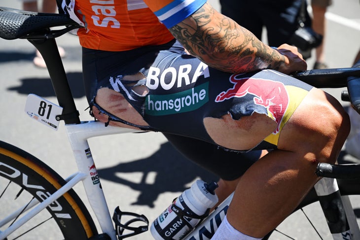 Just 1km into the stage, Welsford got caught up in a touch of wheels that brought down about 10 or so riders. He was able to remount and carry on, his shorts tattered, and set up perfectly for the final sprint to win with a much more comfortable margin than stage 1.
