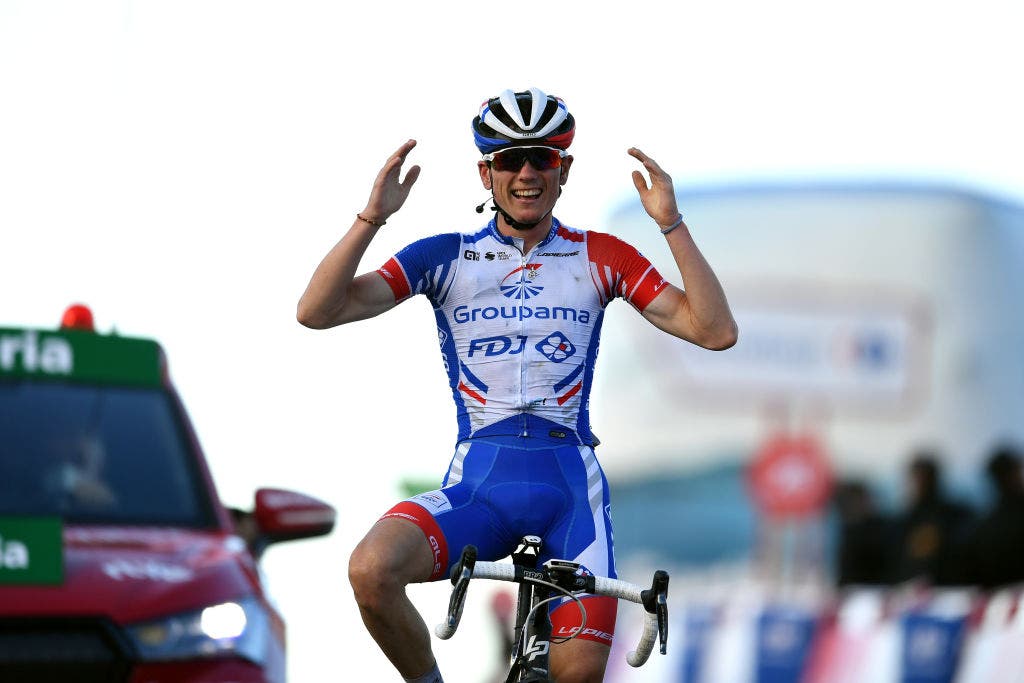 The good news: Gaudu was a huge winner on Saturday as he won the stage — his second of the race — and vaulted from 11th place into 8th place in the GC standings, jumping past Felix Grossschartner, Aleksandr Vlasov, and Alejandro Valverde in the standings. This is a huge turn of events, considering Gaudu’s GC placings throughout the race. He lost minutes in the opening two stages, and then started to ride consistently in the front group, hunting for stages and looking to ride with the top racers. Along the way he took his first grand tour stage win on stage 11, and then made the daylong breakaway on Saturday, only to drop Ion Izaguirre on the final push to the line.
