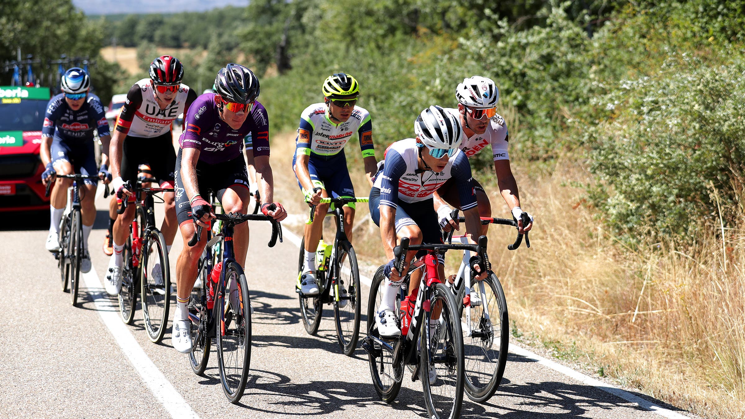Danny Navarro (Burgis BH) attacked the chase group and brought along Yates and de la Cruz before Alejandro Valverde, Enric Mas, Miguel Ángel López (Movistar Team), and Roglič chased to limit time gaps on the stage.