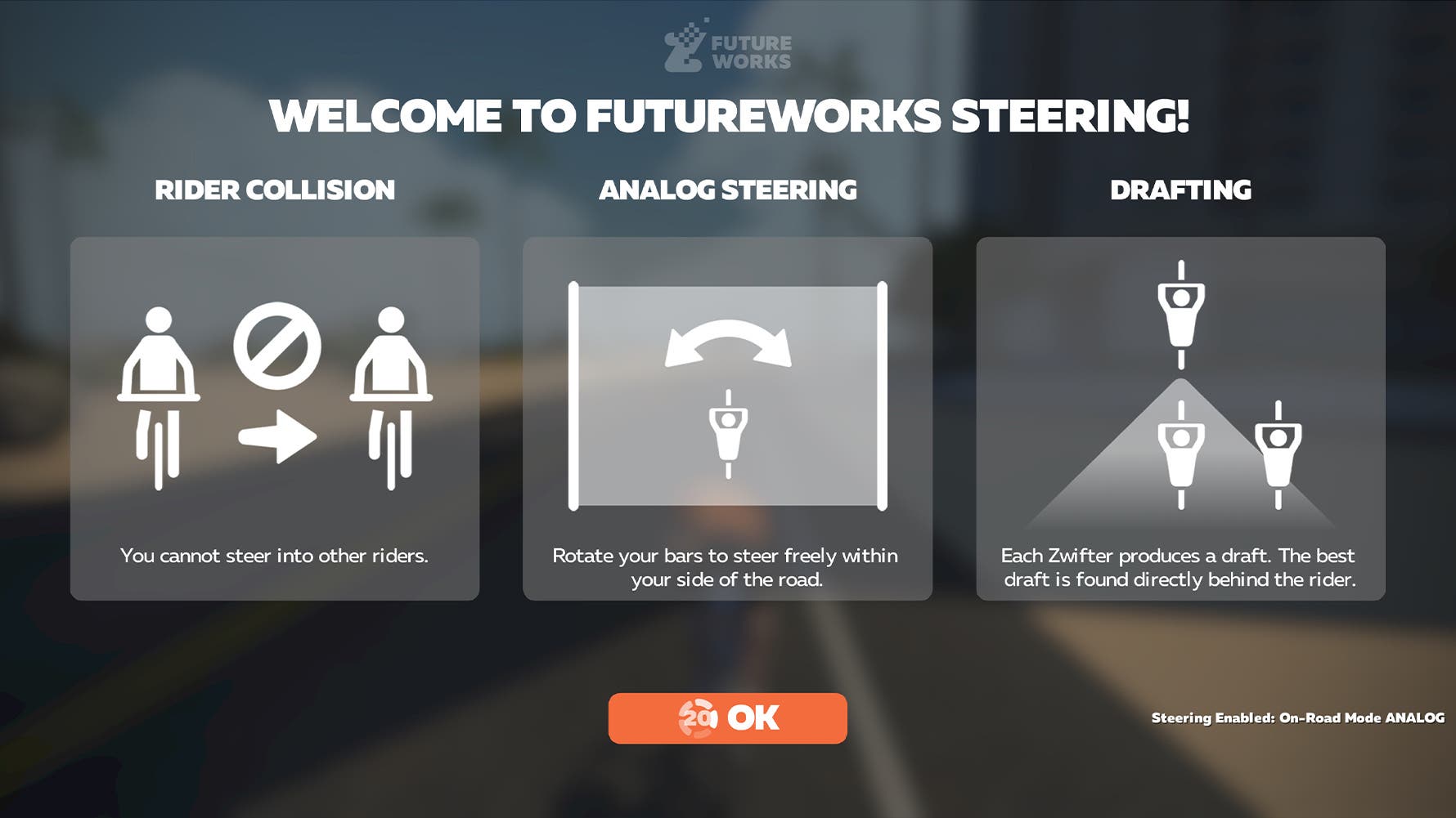 Normally in Zwift, your pedaling controls your avatar’s speed, but steering is determined by the game. Now, with what Zwift is calling FutureWorks Steering activated, you can decide whether to sit on a rider’s wheel, or steer around them to pass. Similarly, if you want to stay on a particular rider’s wheel as they are moving through a bunch, you’ll have to steer to follow.
