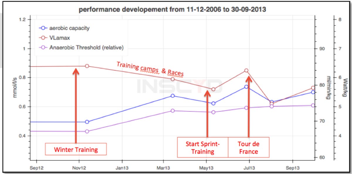 Graph 1: Example 2013 season of how a World Tour rider who is focused on the Spring Classics and a possible sprint win at the Tour de France balanced his anaerobic threshold and VLamax through the season. Notice that he raised and held his threshold through the season, but his VLamax fluctuated.