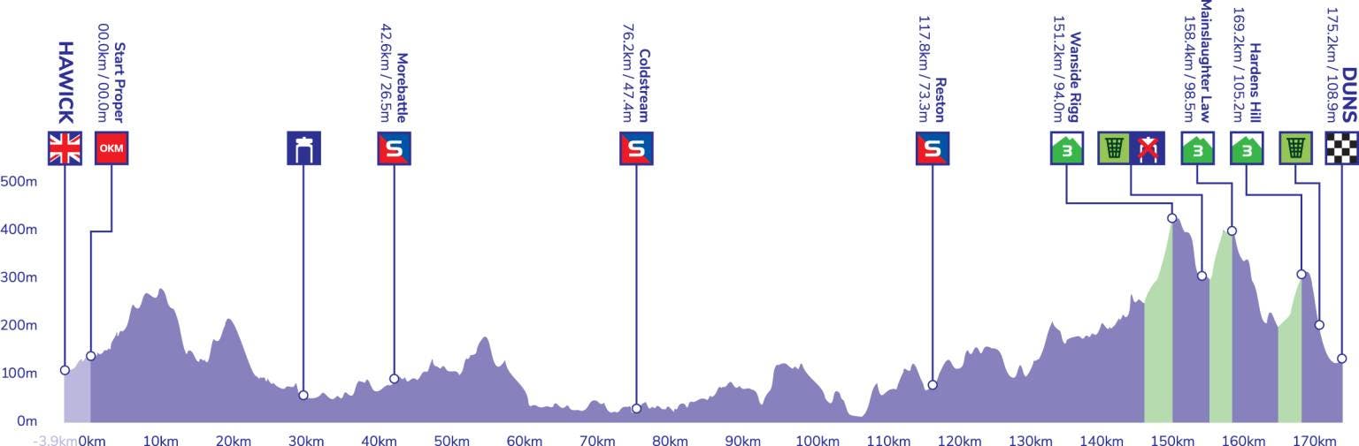 Stage two of the Tour of Britain brought the riders in a northern direction from Hawick to Duns, with the 175.2km route totaling 2,457 meters of elevation. It contained three intermediate sprints and, in the final 30 kilometers, the category three climbs of Wanside Rigg (km 151.2), Mainslaughter Law (km 158.4) and Hardens hill (km 169.2).