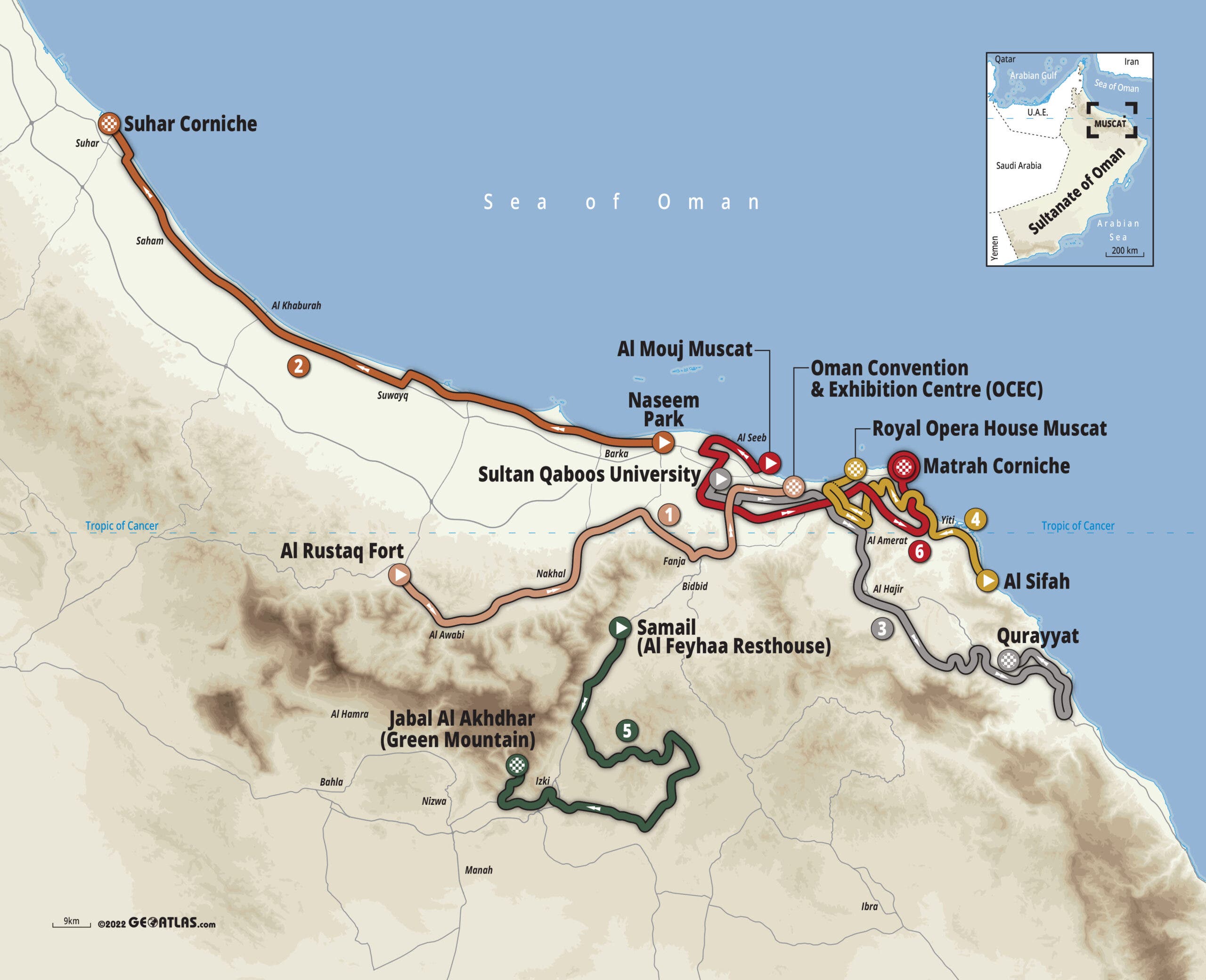 The 891km route highlights the diversity of terrain and landscapes that define the easternmost country on the Arabian Peninsula, with a mix of sprint and climbing stages.