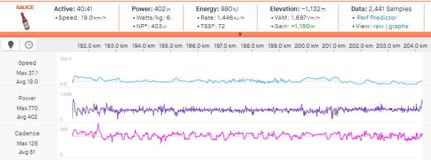 Normalized Power: 374w (6.2w/kg)