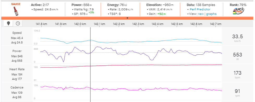 Attack on steepest grade: 579w (9.8w/kg) for 46 seconds