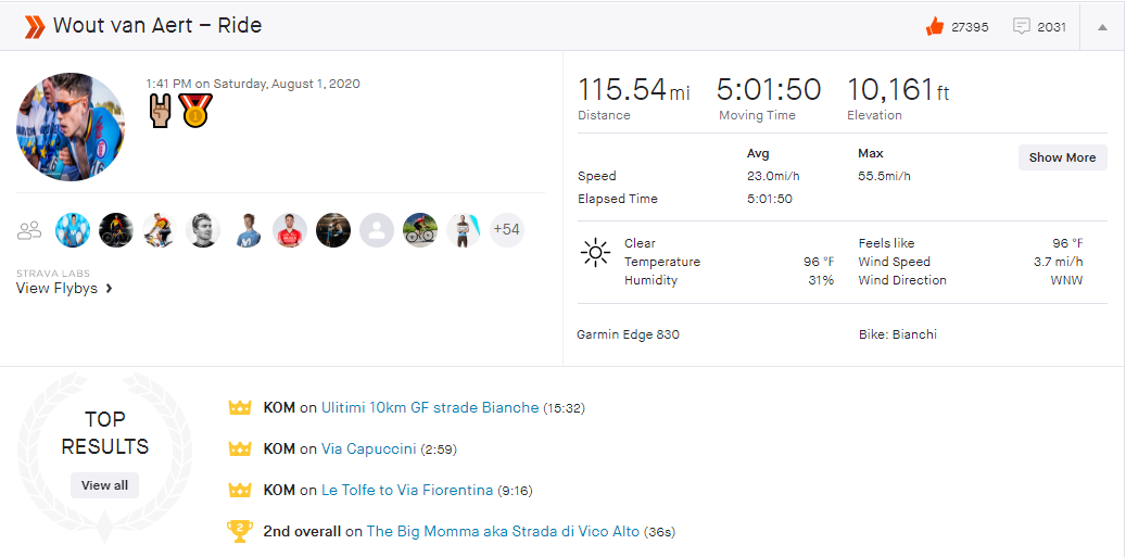 Despite post-lockdown uncertainty and extreme heat, van Aert’s physical performance was one for the books – after the entire five-hour race, van Aert finished with a normalized power of 350 watts. In this column, we dive into the unbelievable power output from van Aert and others at this year’s Strade Bianche.