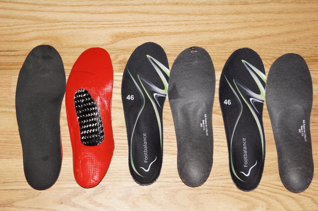 Specialized BG shoes used to intentionally supinate the feet, as did the “Big Meat” cleat shims that canted the cleat and were popular in the 1990s. All I had to do was ride a few days with either of those setups and I was back in the IT-band-pain cave. Now, I make sure I only ride in shoes whose soles have constant thickness across the metatarsal area, and I add a thin Specialized BG wedge under the orthotic in my left shoe to lift the lateral edge of that foot. This keeps my IT bands happy.