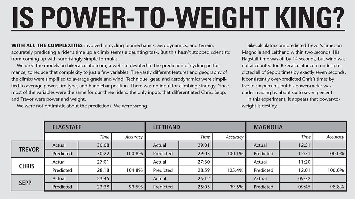 Trevor and I looked to answer a few key questions: Is, as conventional wisdom holds, climbing simply a matter of power-to-weight ratio? In other words, is power-to-weight a perfect predictor of your time up a climb? How much do terrain and technique come into play? And finally, do different rider types have an advantage on different types of climbs?