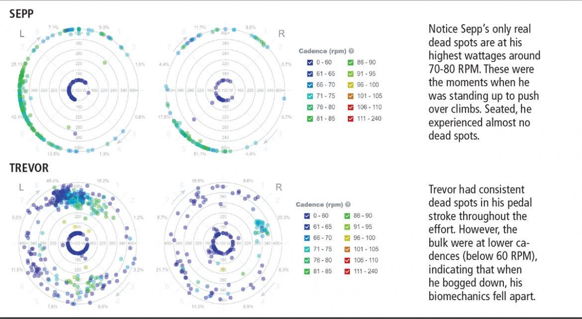 An analysis of their left and right pedal strokes (below) clearly shows that Sepp was smoother and more economical. Dots indicate where dead spots occurred in the pedal stroke and at what wattage, while the colors indicate at what cadence. The better the pedal stroke, the fewer the dots.